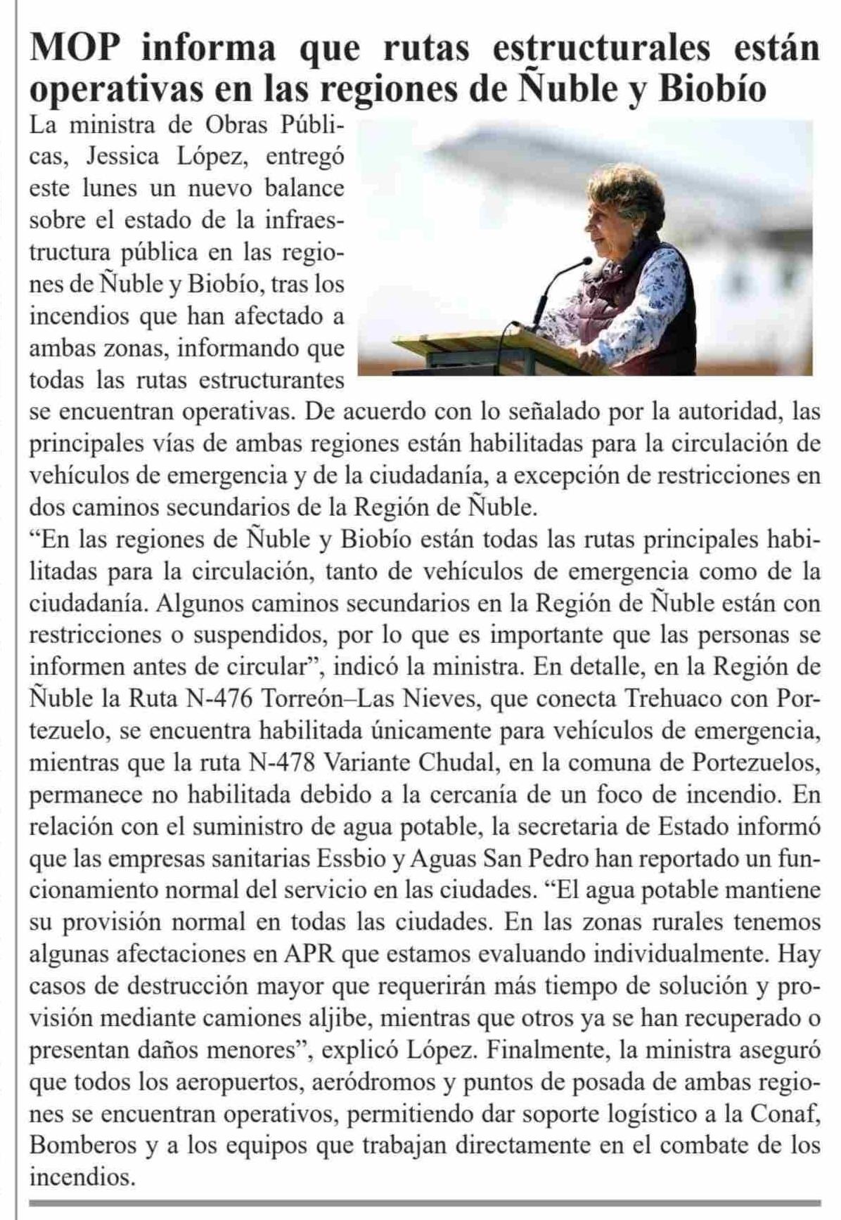 Título: MOP informa que rutas estructurales están operativas en las regiones de Nuble y Biobío