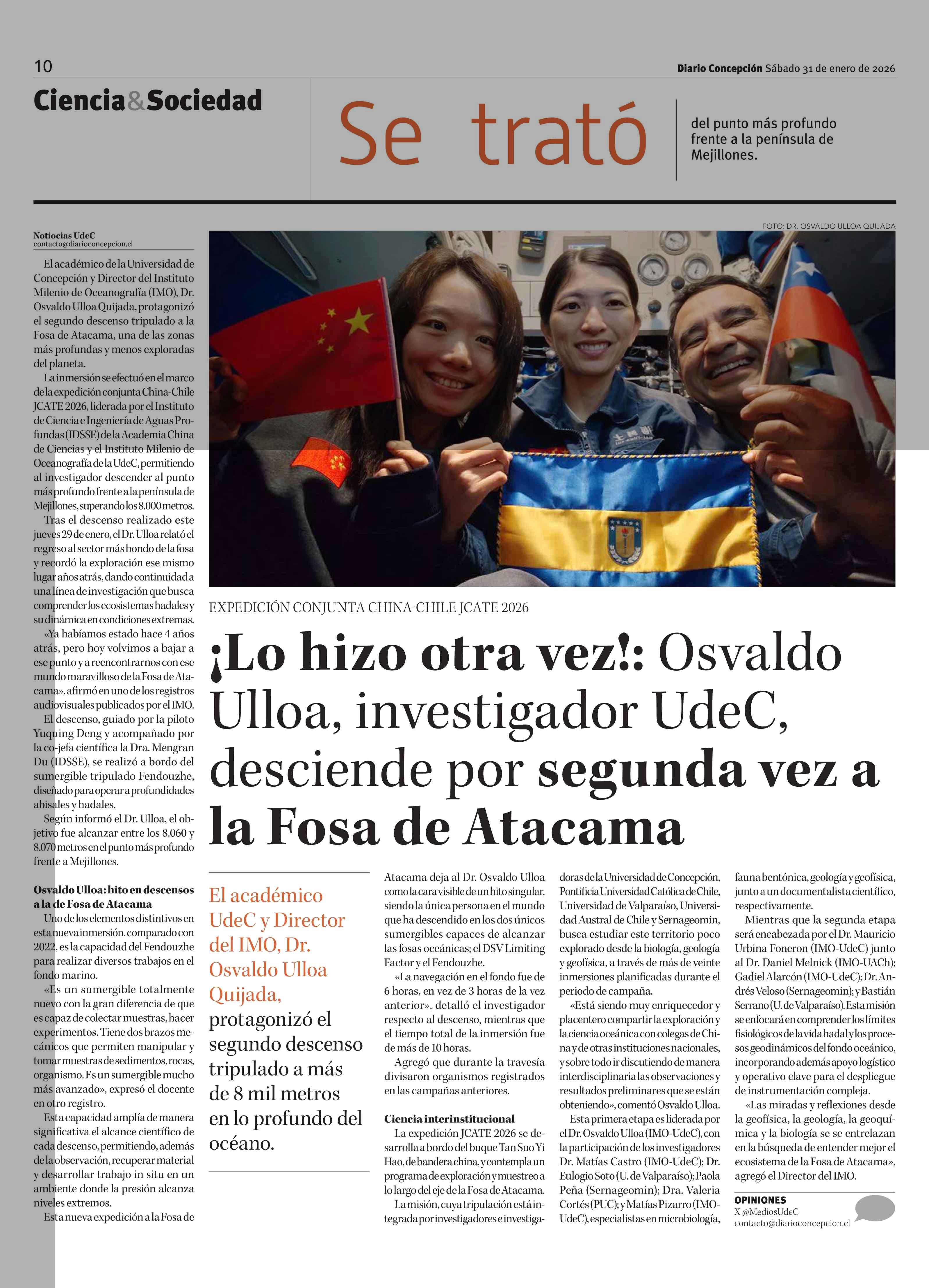 ¡Lo hizo otra vez !: Osvaldo Ulloa, investigador UdeC, desciende por segunda vez a la Fosa de Atacama 31-01-2026 Diario Concepción |