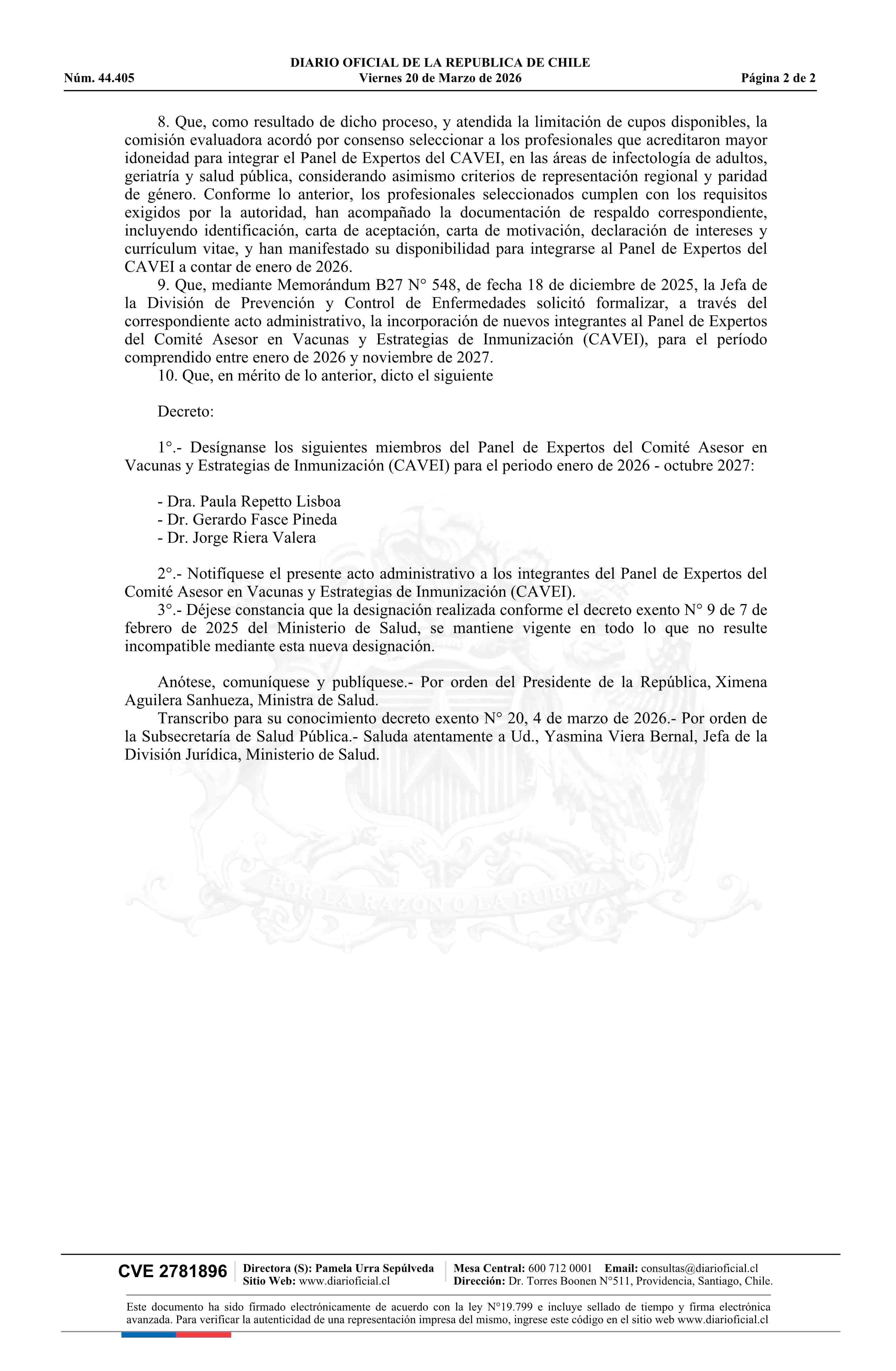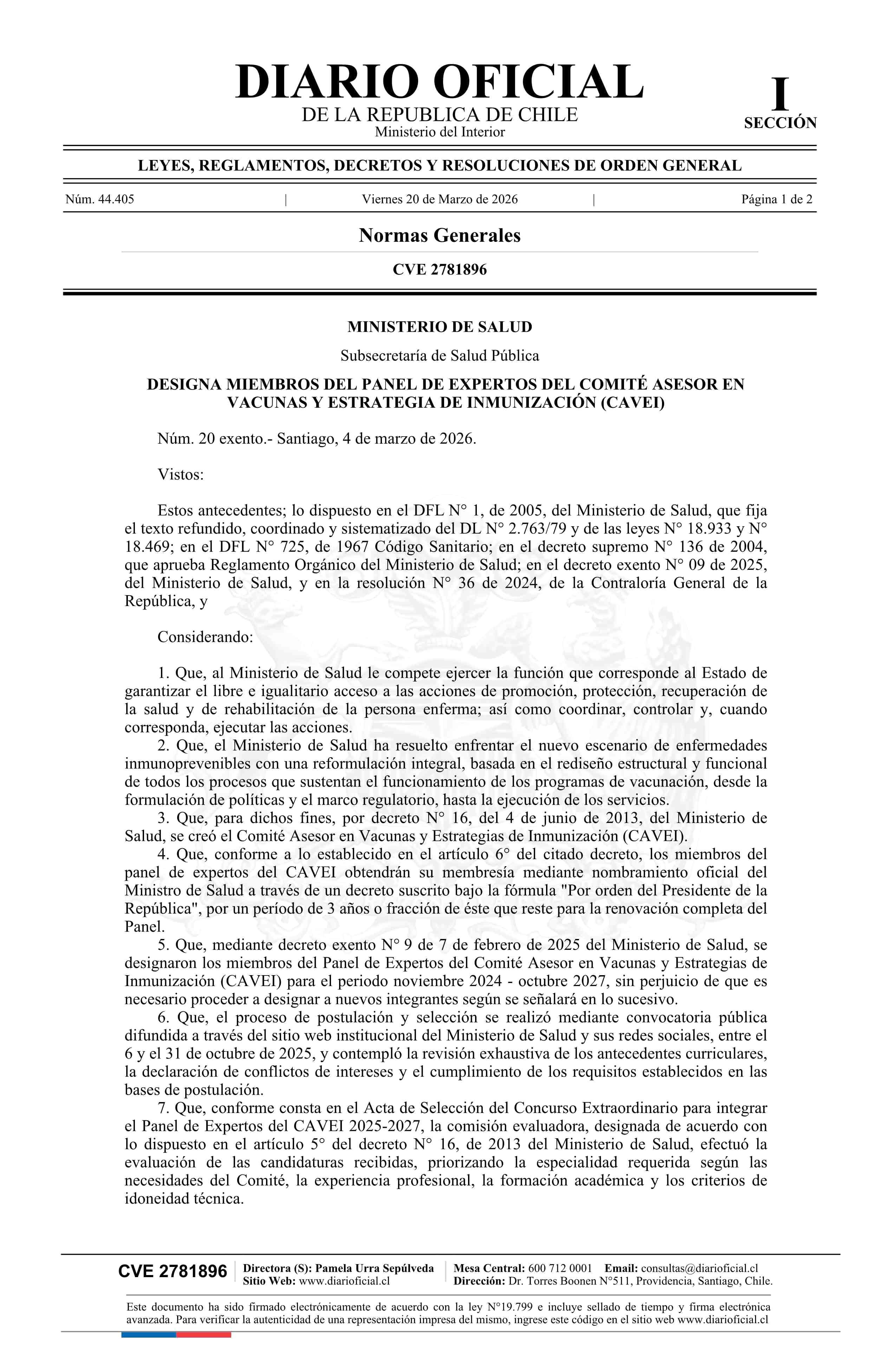 | Título: | Decreto exento número 20, de 2026.- Designa Miembros del Panel de Expertos del Comité Asesor en Vacunas y Estrategia de Inmunización |