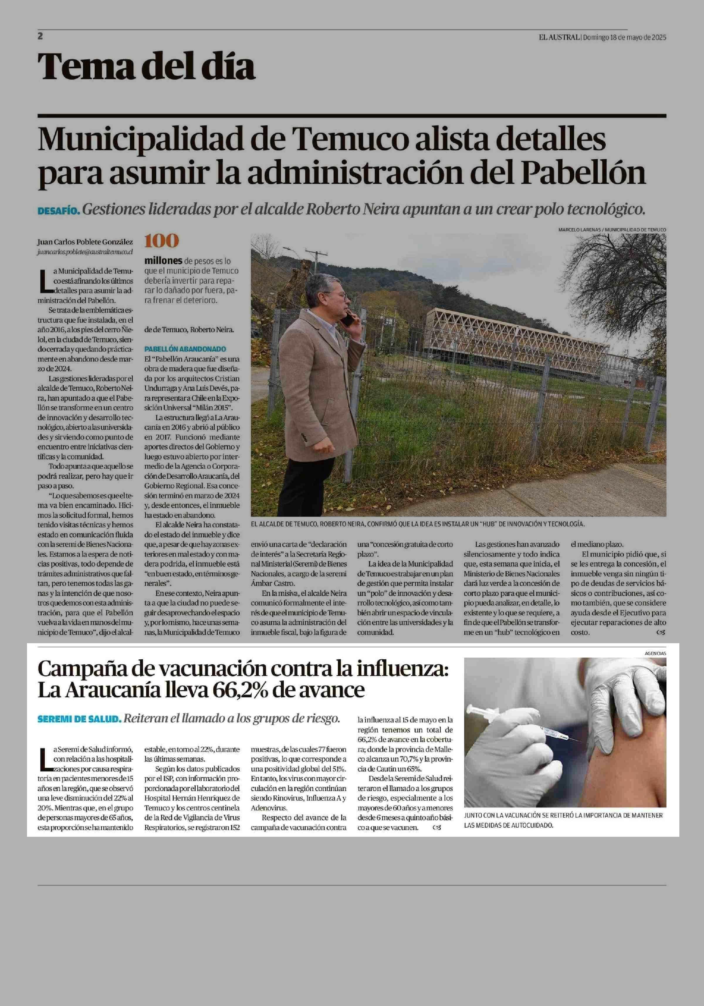 Campaña de vacunación contra la influenza: La Araucanía lleva 66,2% de avance 18-05-2025 El Austral de la Araucanía |
