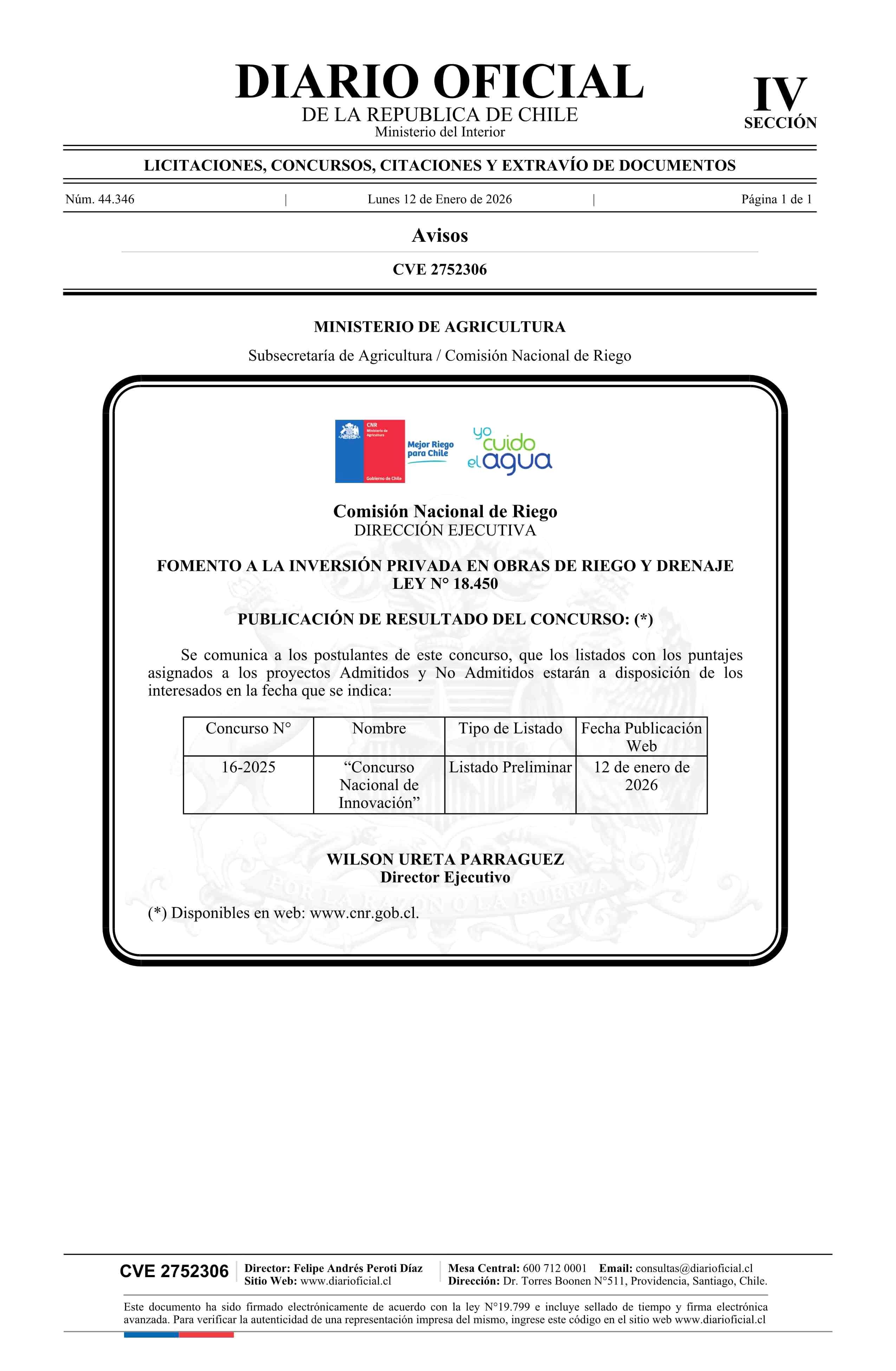 AVISO LICITACIONES: Fomento a la inversión privada en obras de riego y drenaje ley N° 18.450 12-01-2026 Diario Oficial Edición Electrónica |