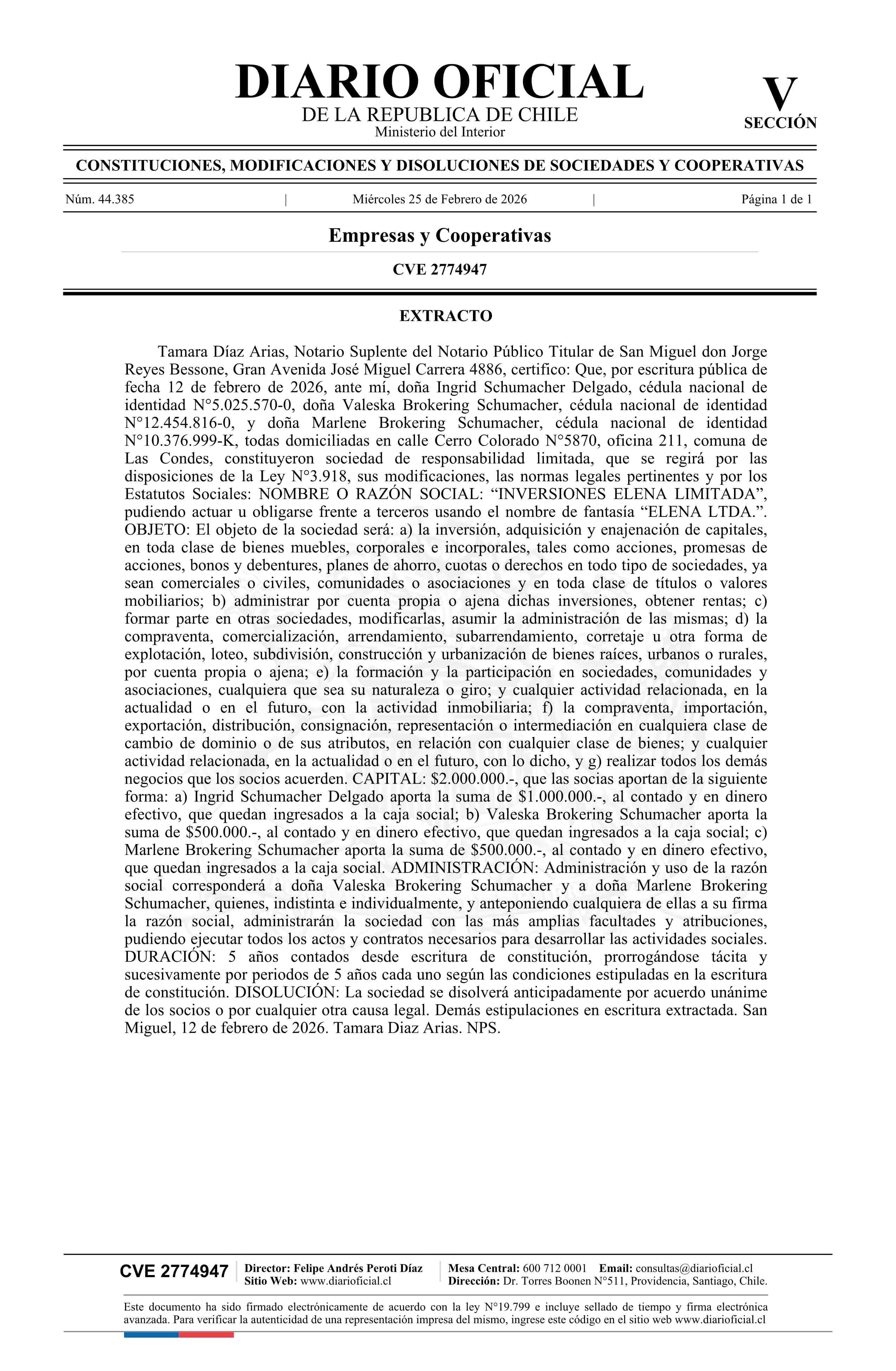 INVERSIONES ELENA LIMITADA 25-02-2026 Diario Oficial Edición Electrónica |