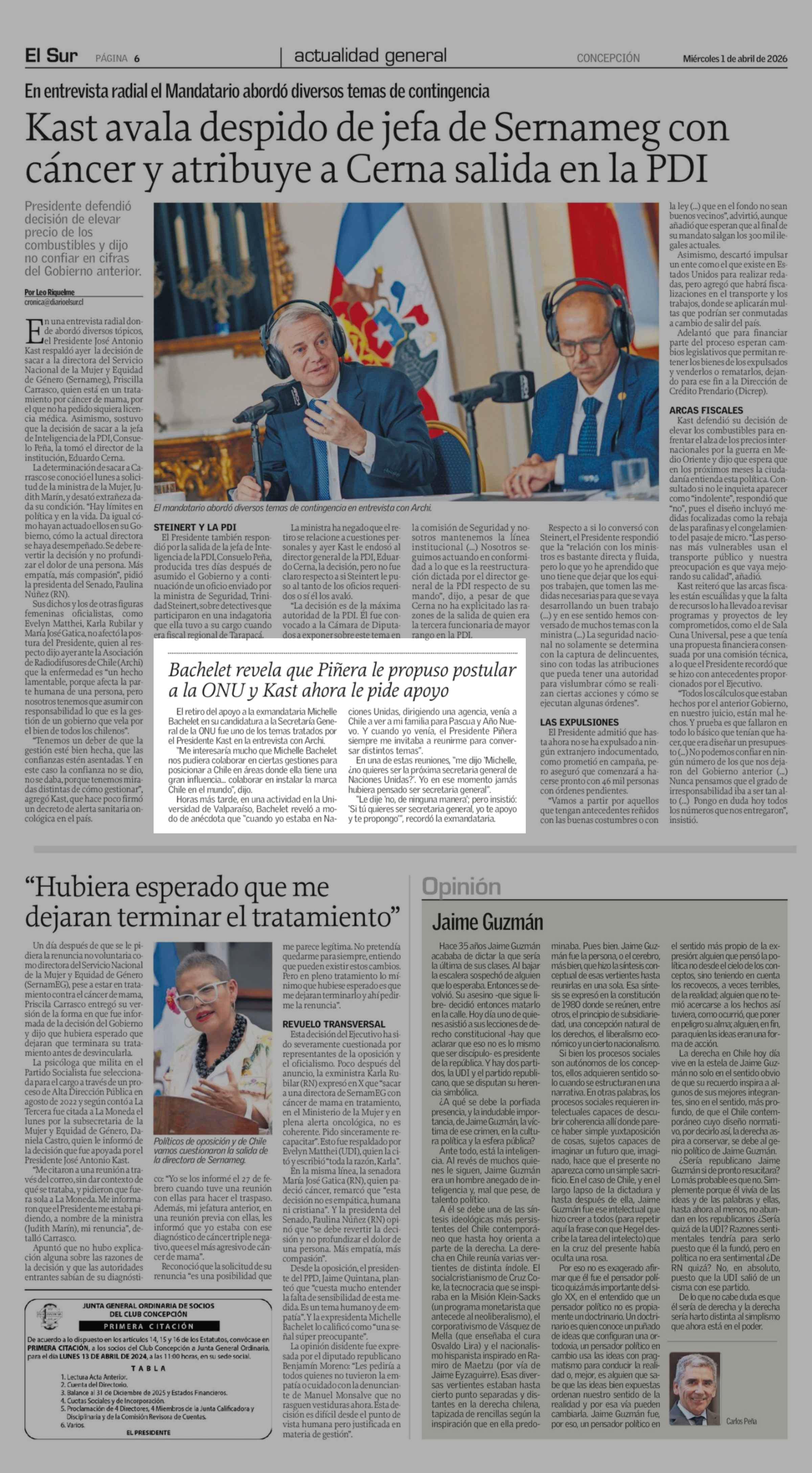 | Título: | ....... Bachelet revela que Piñera le propuso postular a la ONU y Kast ahora le pide apoyo El retiro del apoyo a la exmandataria Michelle ciones Unidas, dirigiendo una agencia, venía a Chile a ver a mi familia para Pascua y Año NueBachelet en su candidatura a la Secretaría Genevo. Y cuando yo venía, |