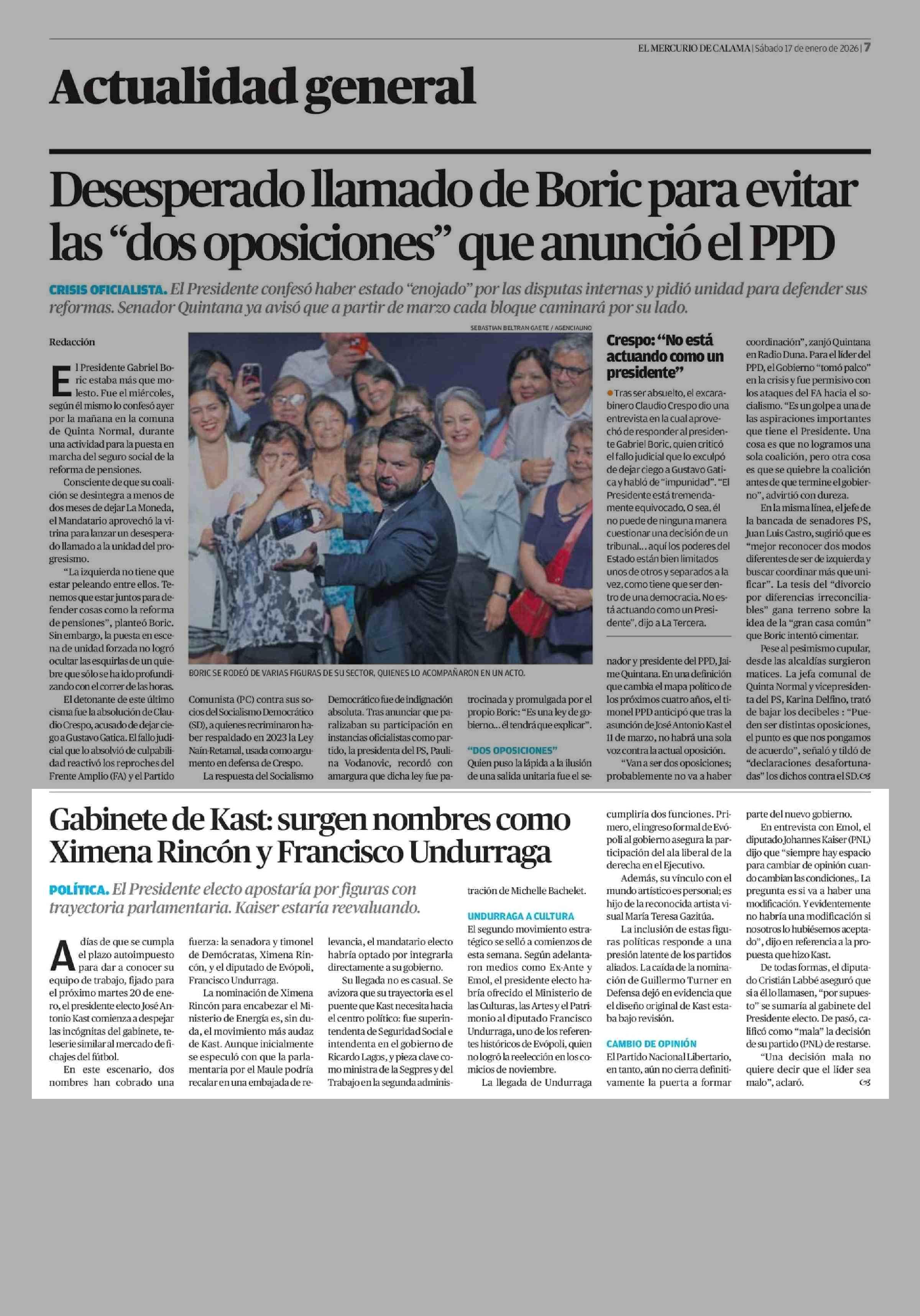 Gabinete de Kast: surgen nombres como Ximena Rincón y Francisco Undurraga 17-01-2026 El Mercurio de Calama |