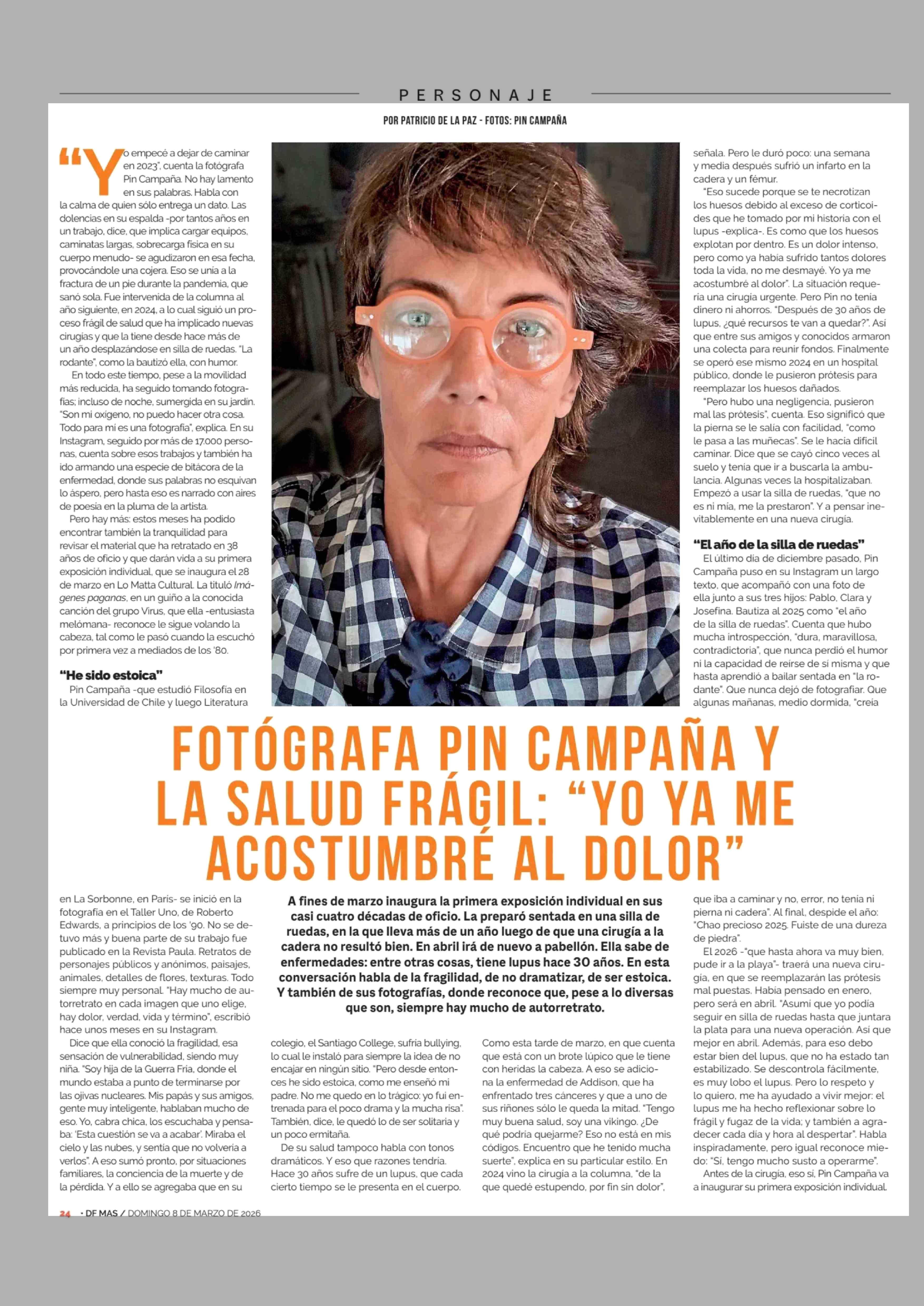 FOTÓGRAFA PIN CAMPAÑA Y LA SALUD FRAGIL: "YO YA ME ACOSTUMBRE AL DOLOR" 08-03-2026 Diario Financiero |