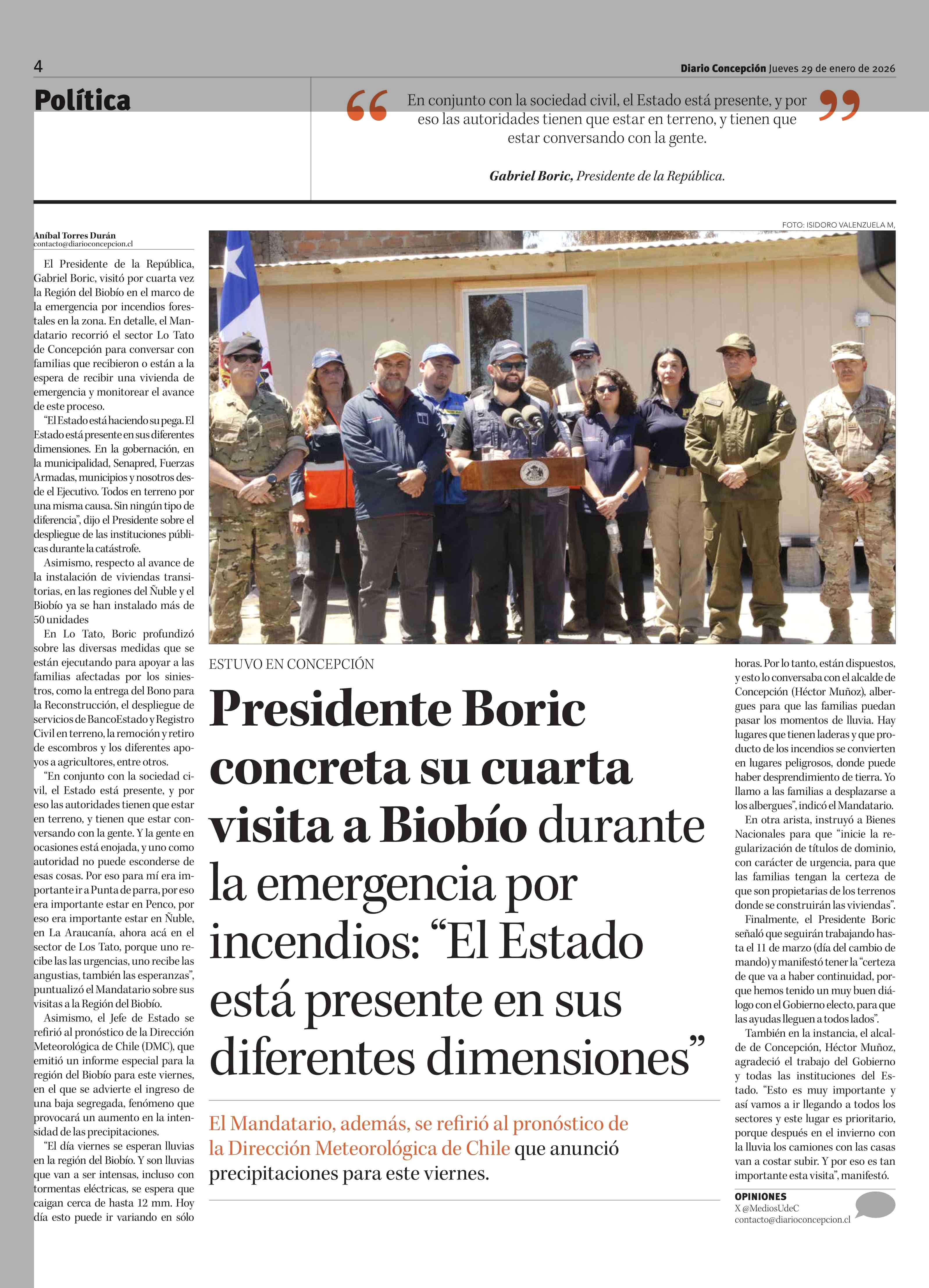 Presidente Boric concreta su cuarta visita a Biobío durante la emergencia por incendios: "El Estado está presente en sus diferentes dimensiones" 29-01-2026 Diario Concepción |