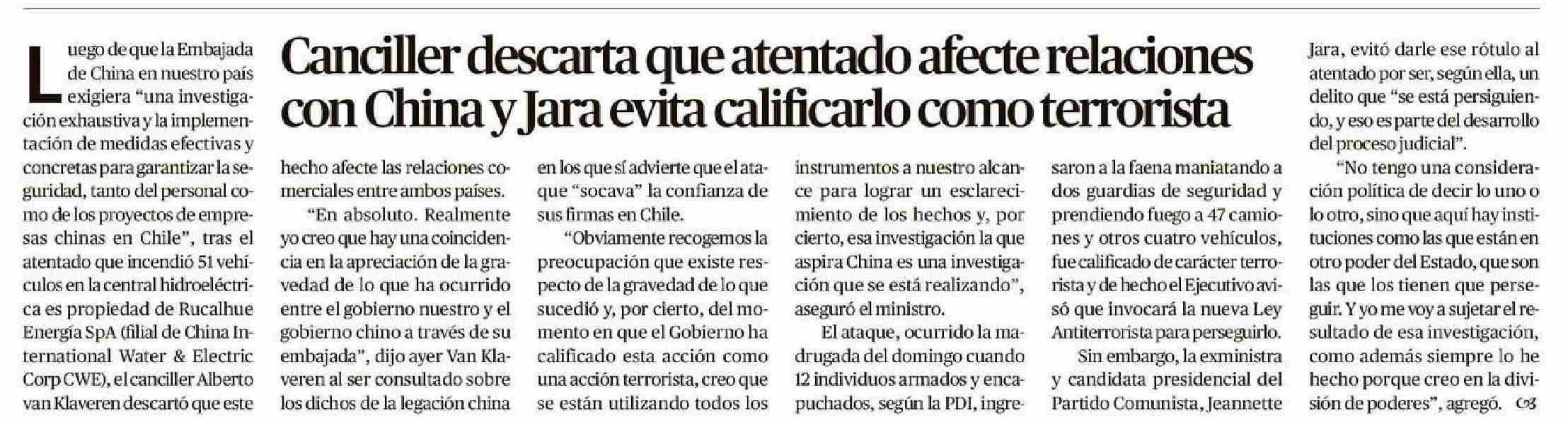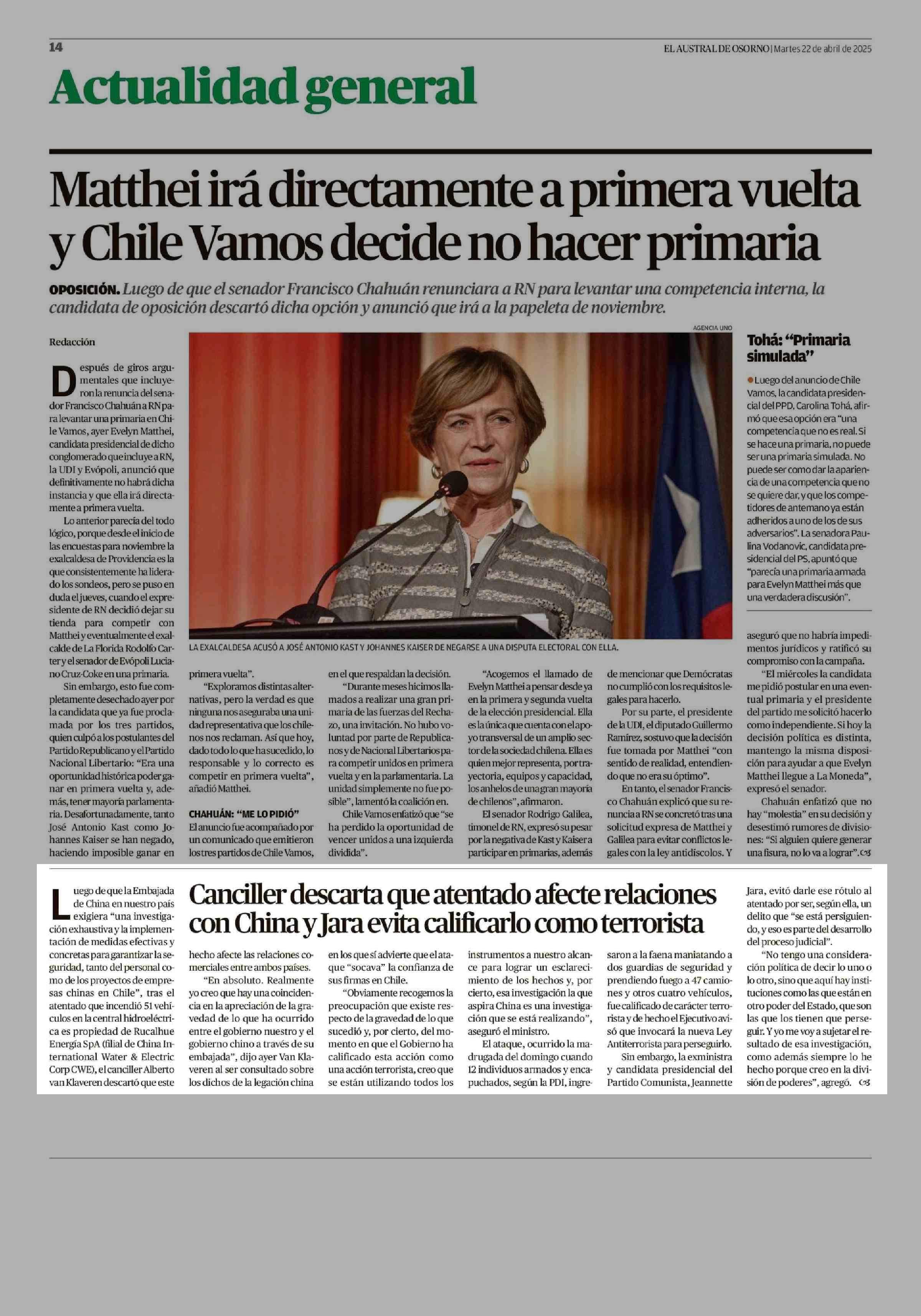 Canciller descarta que atentado afecte relaciones con China y Jara evita calificarlo como terrorista 22-04-2025 El Austral de Osorno |