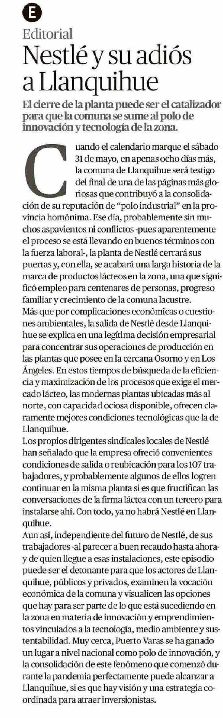| Título: | EDITORIAL: Nestlé y su adiós a Llanquihue |