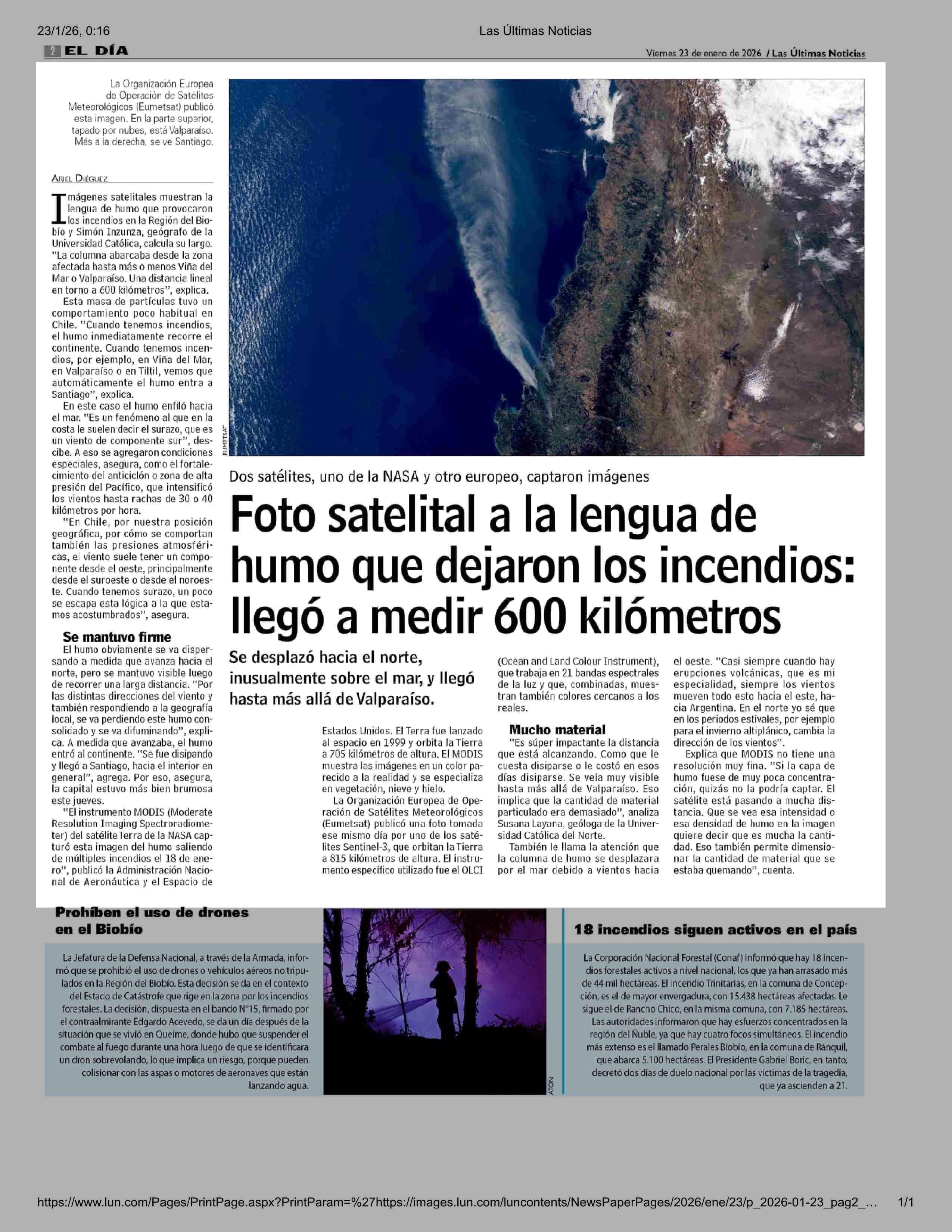 Foto satelital a la lengua de humo que dejaron los incendios: llegó a medir 600 kilómetros 23-01-2026 Las Últimas Noticias |