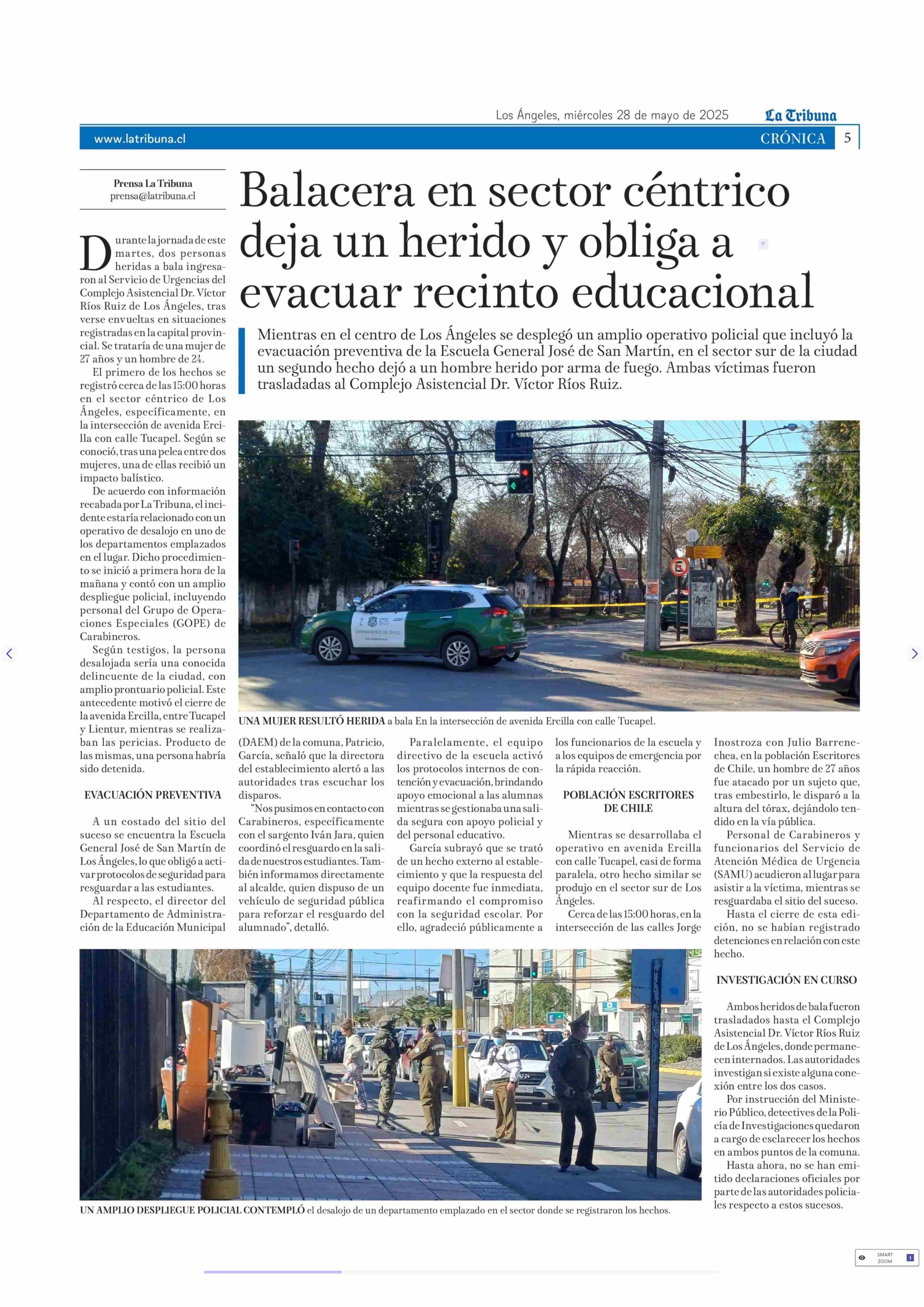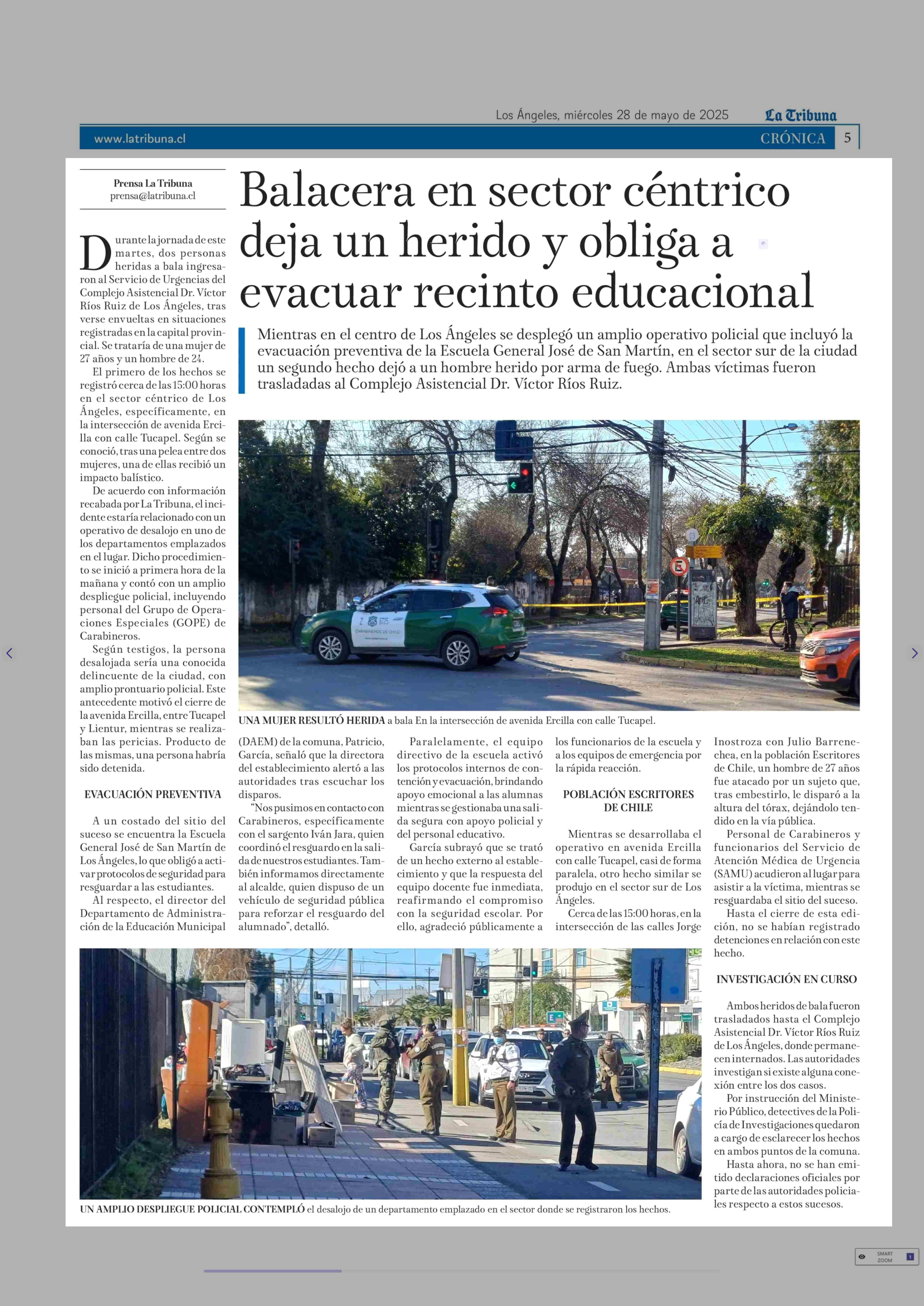 Balacera en sector céntrico deja un herido y obliga a evacuar recinto educacional 28-05-2025 La Tribuna |
