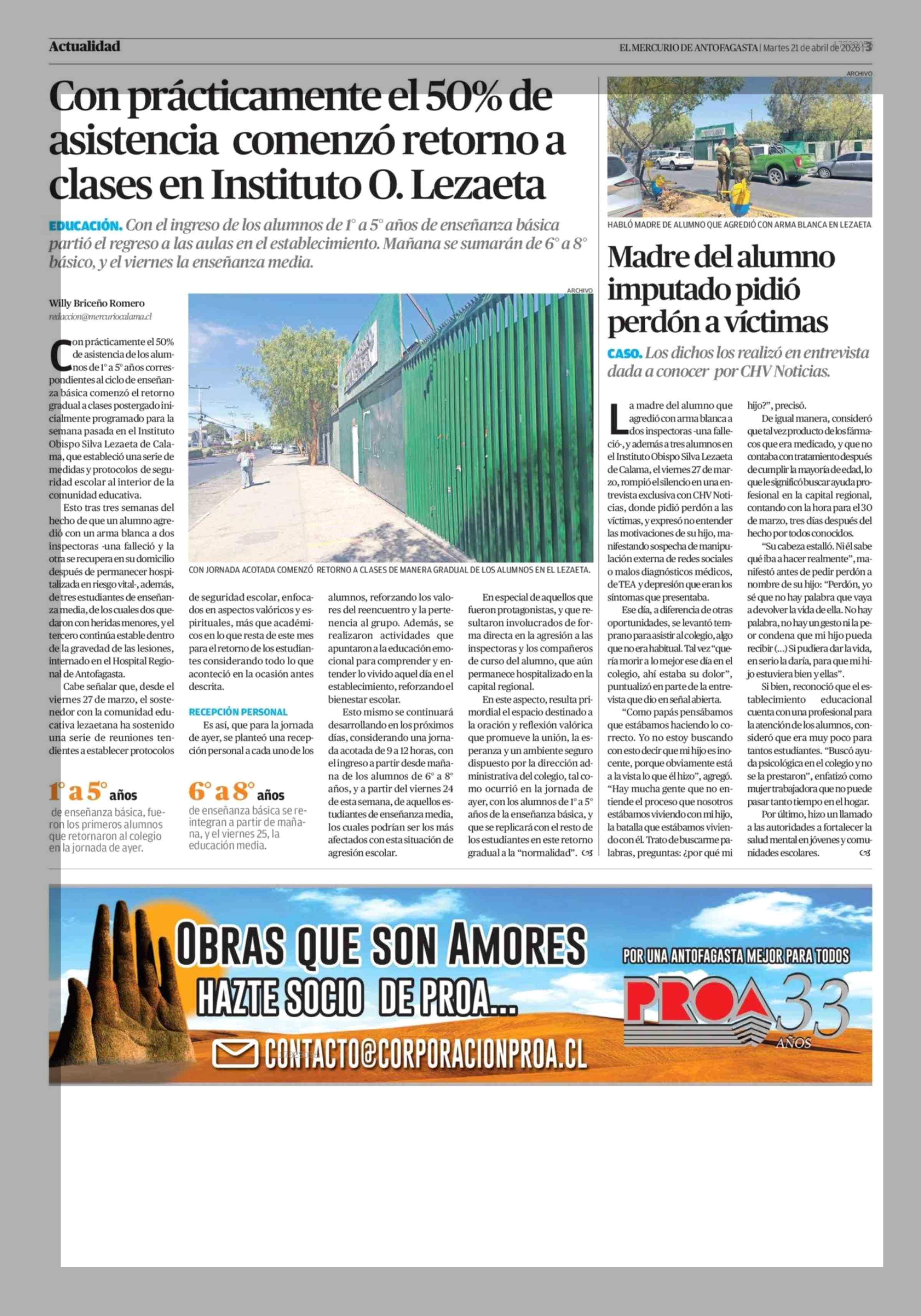 Con prácticamente el 50% de asistencia comenzó retorno a clases en Instituto O. Lezaeta 21-04-2026 El Mercurio de Antofagasta |