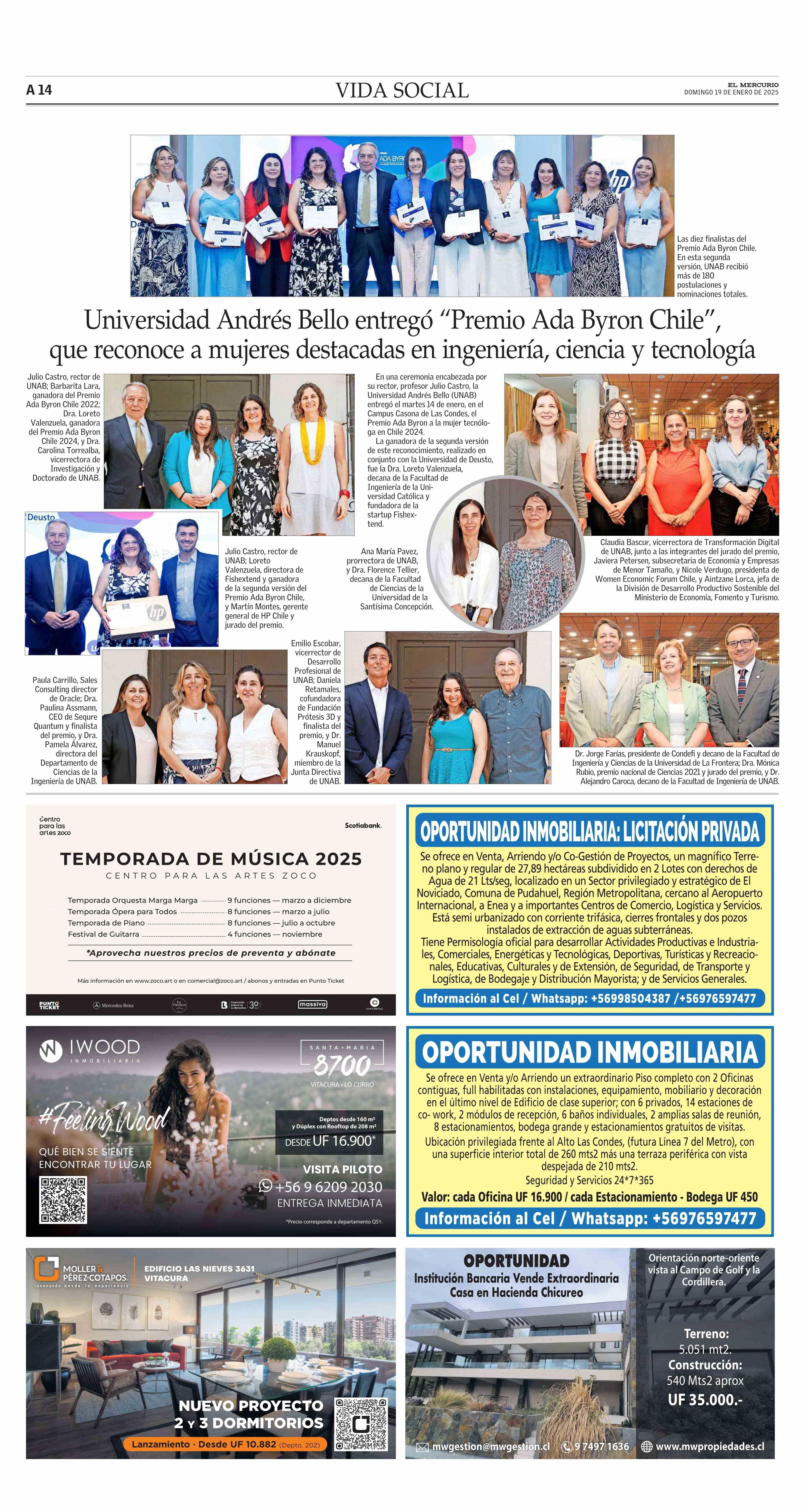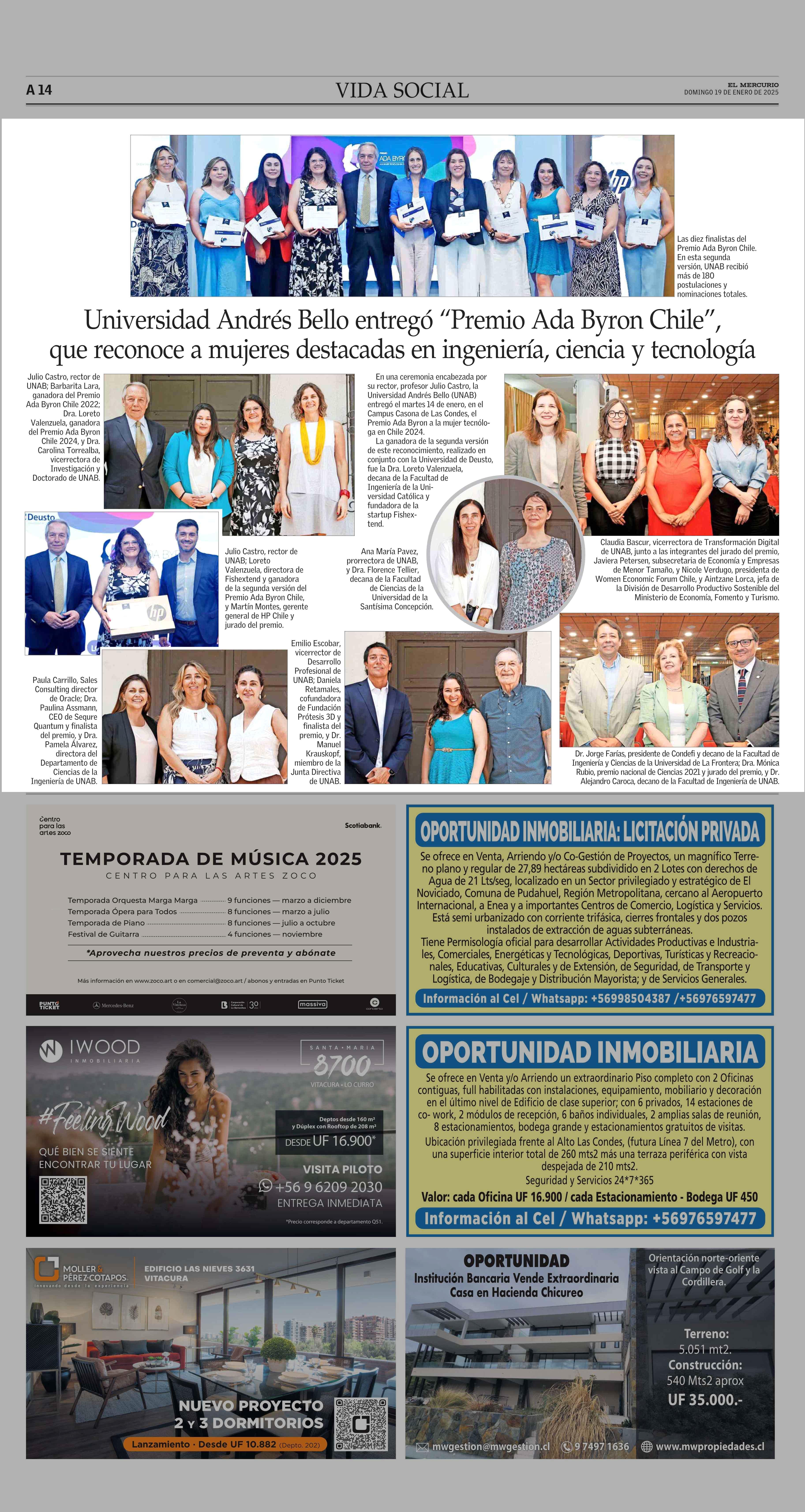 Universidad Andrés Bello entregó “Premio Ada Byron Chile”, que reconoce a mujeres destacadas en ingeniería, ciencia y tecnología 19-01-2025 El Mercurio |
