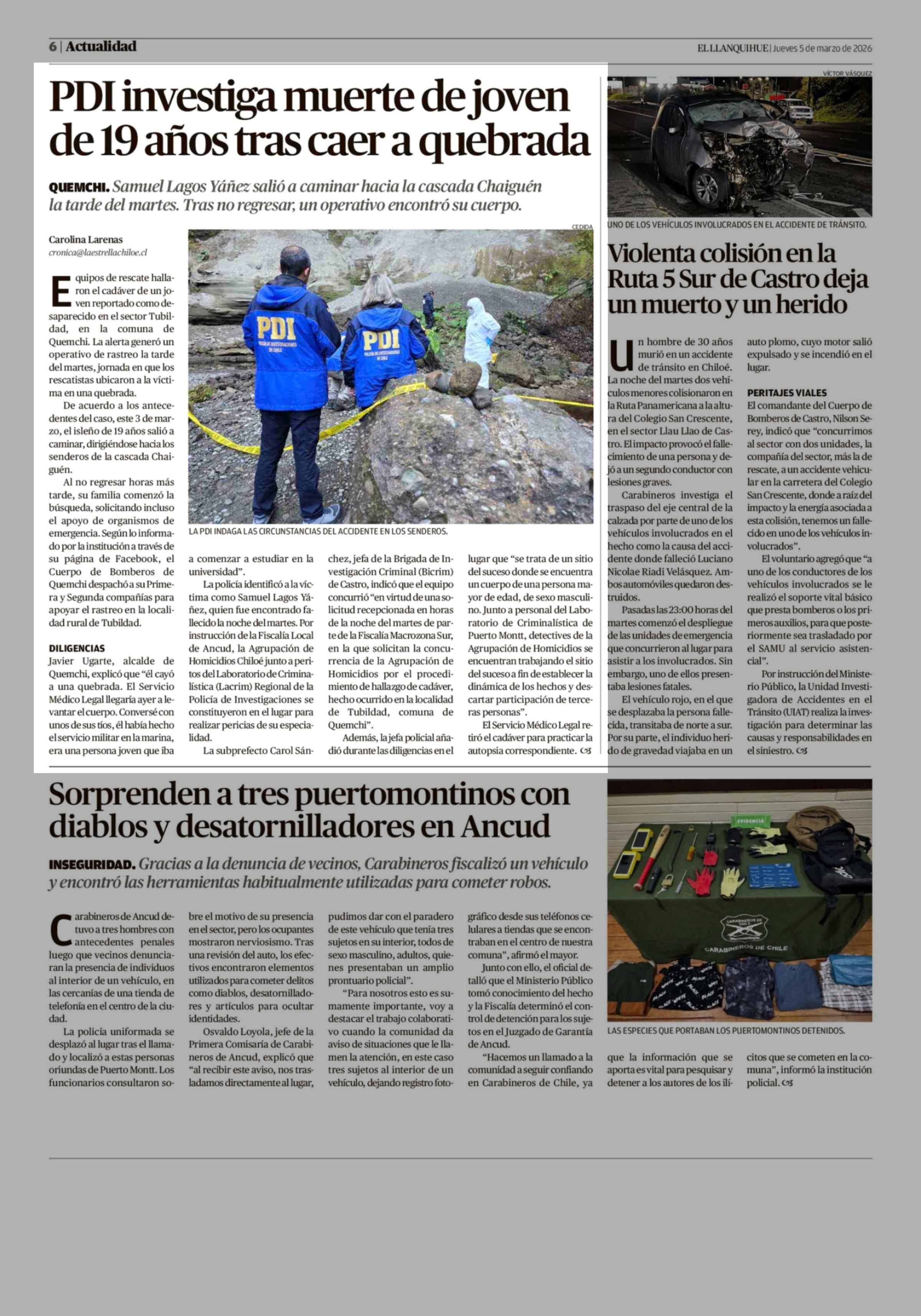PDI investiga muerte de joven de 19 años tras caer a quebrada 05-03-2026 El Llanquihue |