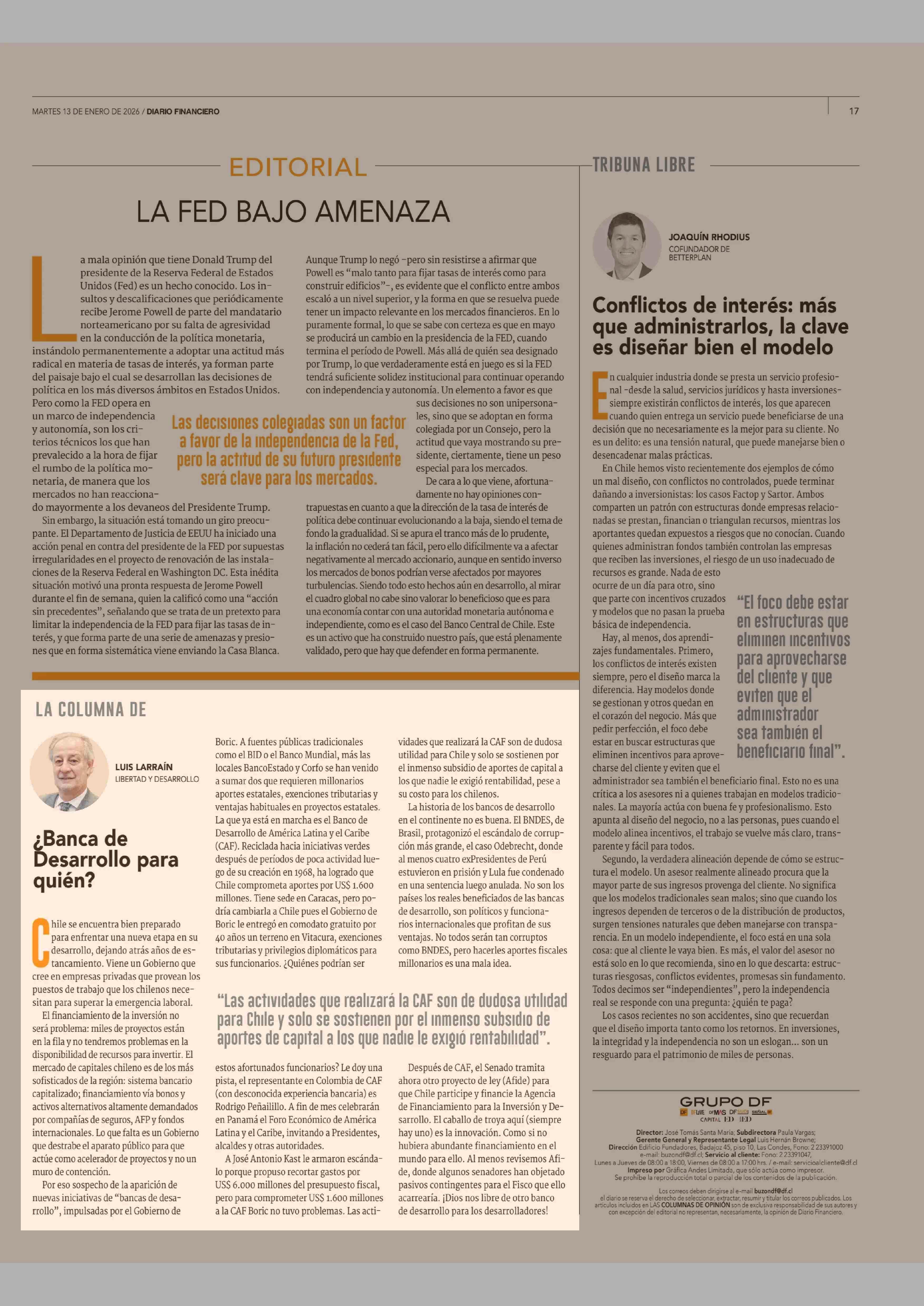 Columnas de Opinión: ¿Banca de Desarrollo para quién? 13-01-2026 Diario Financiero |