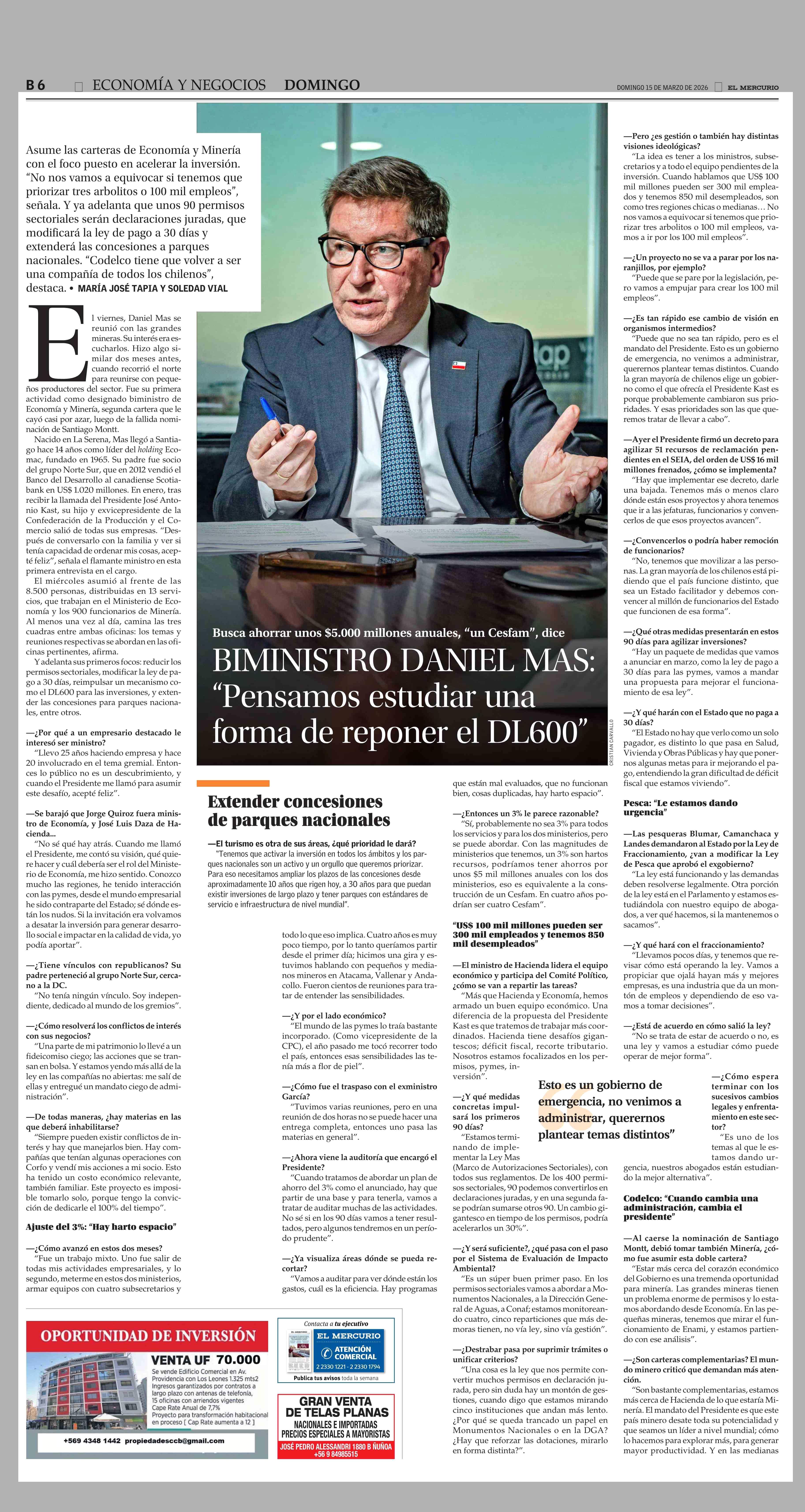 BIMINISTRO DANIEL MAS: “Pensamos estudiar una forma de reponer el DL600” 15-03-2026 El Mercurio |
