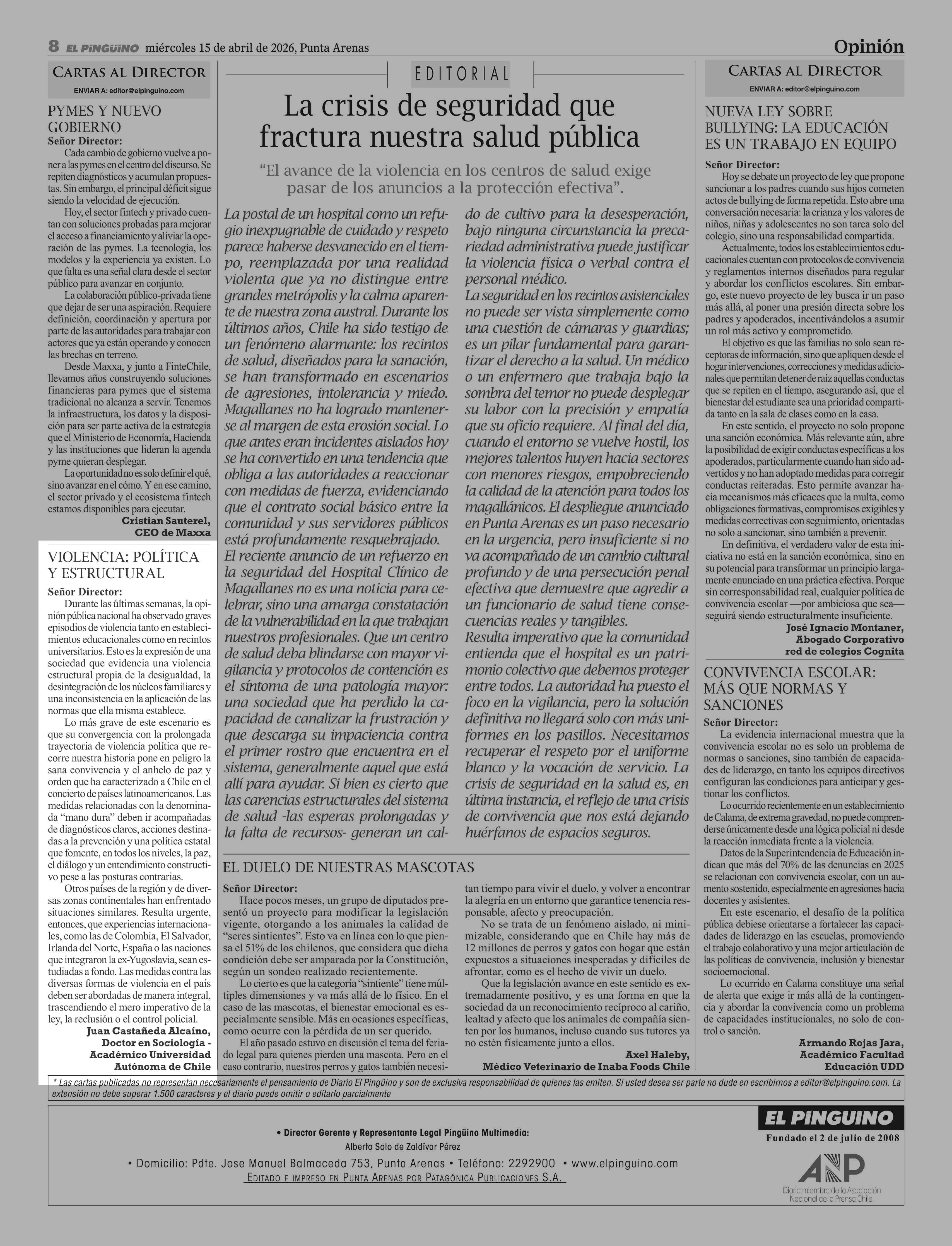 Cartas: VioleNcia: política y estructural 15-04-2026 El Pingüino |