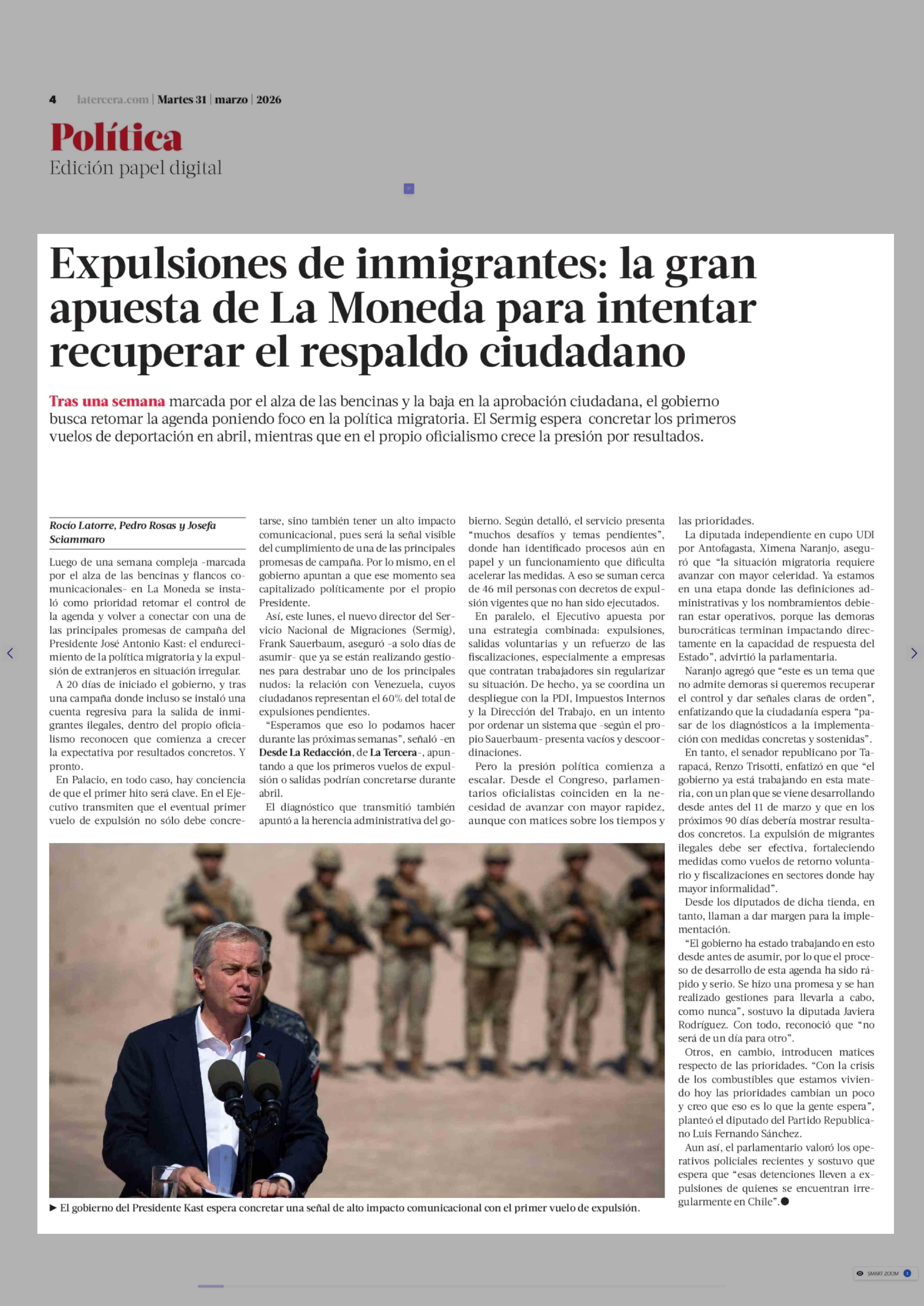 Expulsiones de inmigrantes: la gran apuesta de La Moneda para intentar recuperar el respaldo ciudadano 31-03-2026 La Tercera |