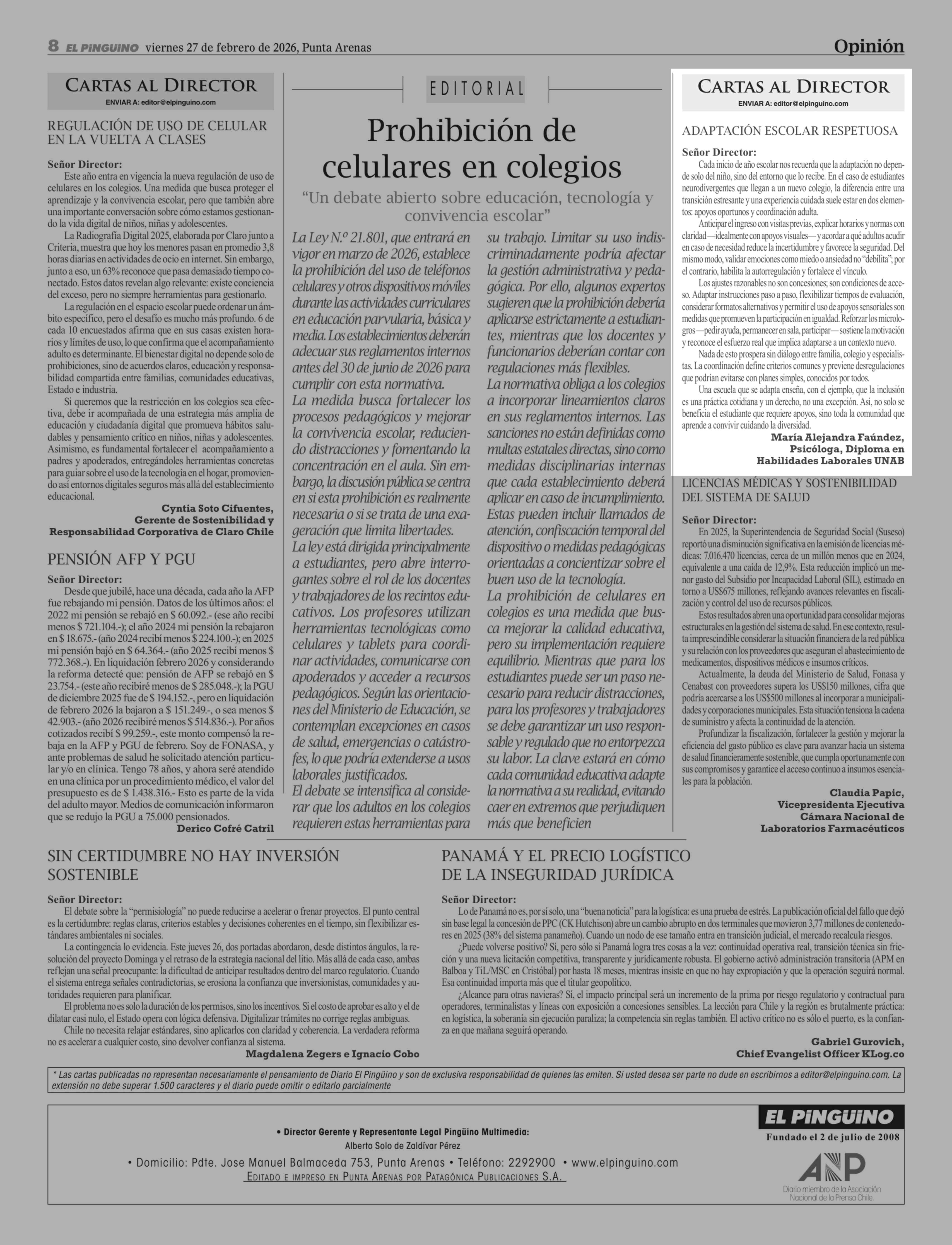 Título: Cartas: ADAPTACIÓN ESCOLAR RESPETUOSA Señor Director: Cada inicio de año escolar nos recuerda que la adaptación no depende solo del niño, sino del entorno que lo recibe. En el caso de estudiantes neurodivergentes que llegan a un nuevo colegio, la diferencia entre una transición estresante y una expe
