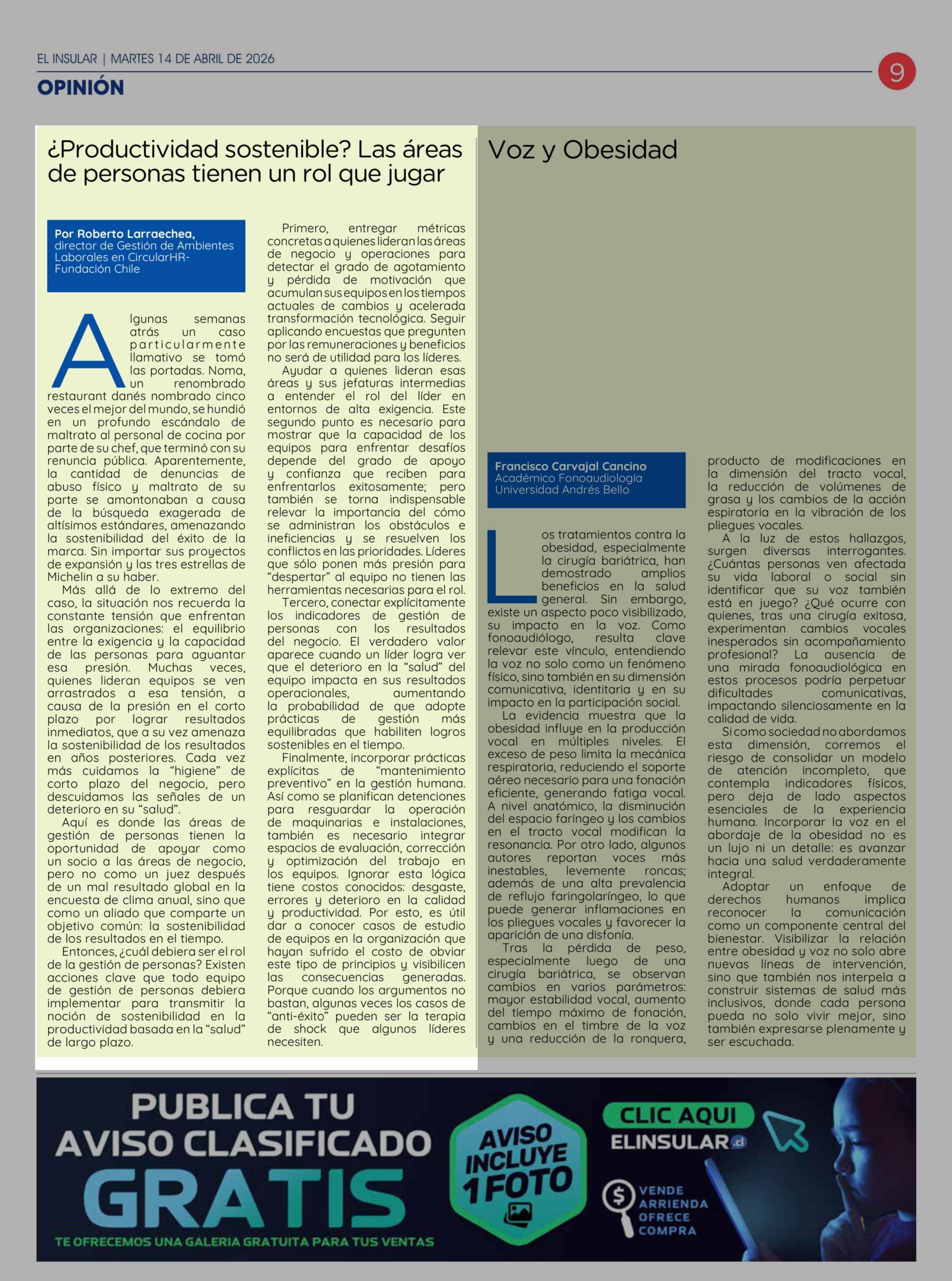 Columnas de Opinión: ¿Productividad sostenible? Las áreas de personas tienen un rol que jugar 14-04-2026 El Insular |