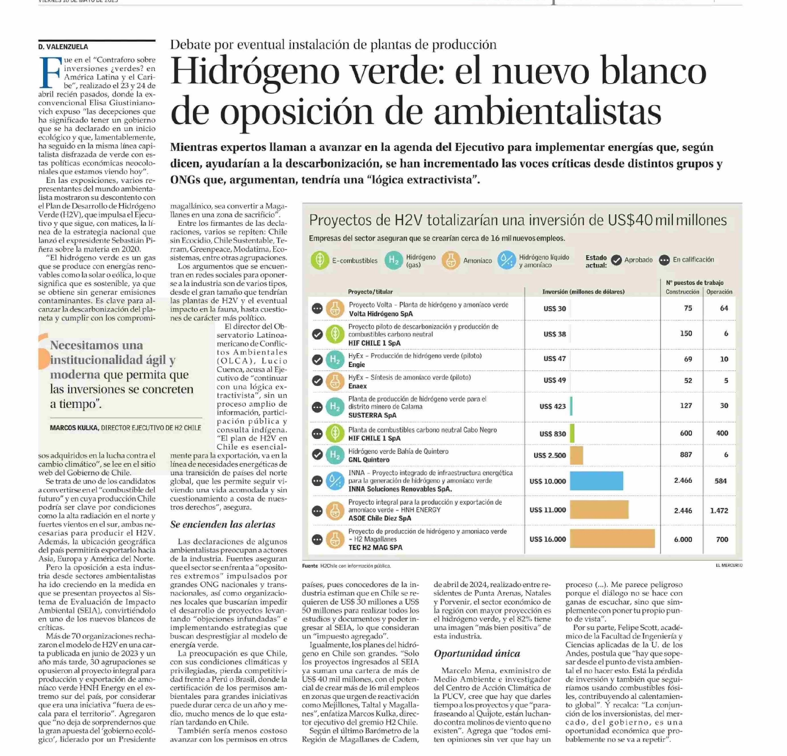 Hidrógeno verde: el nuevo blanco de oposición de ambientalistas 16-05-2025 El Mercurio |
