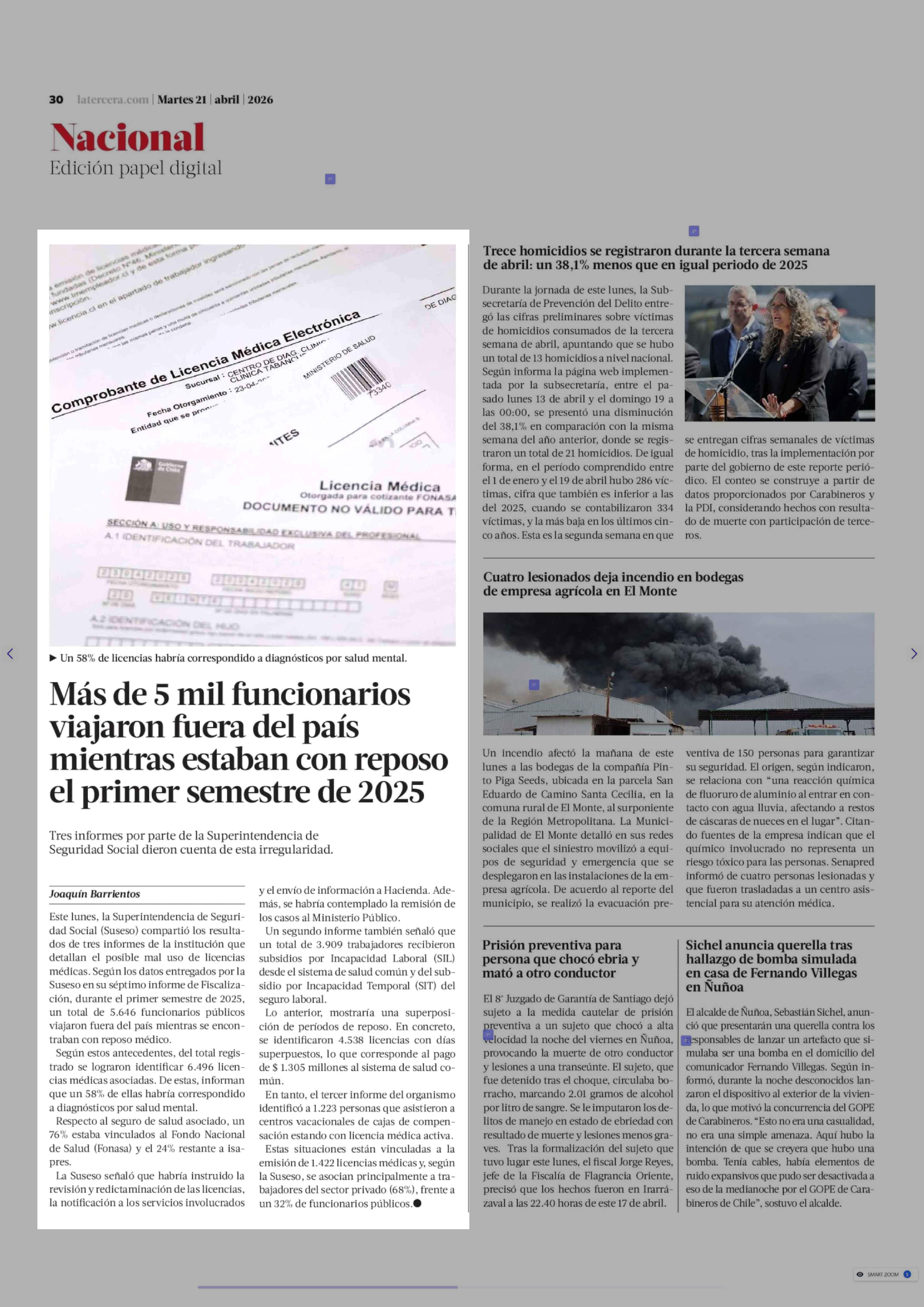 Más de 5 mil funcionarios viajaron fuera del país mientras estaban con reposo el primer semestre de 2025 21-04-2026 La Tercera |