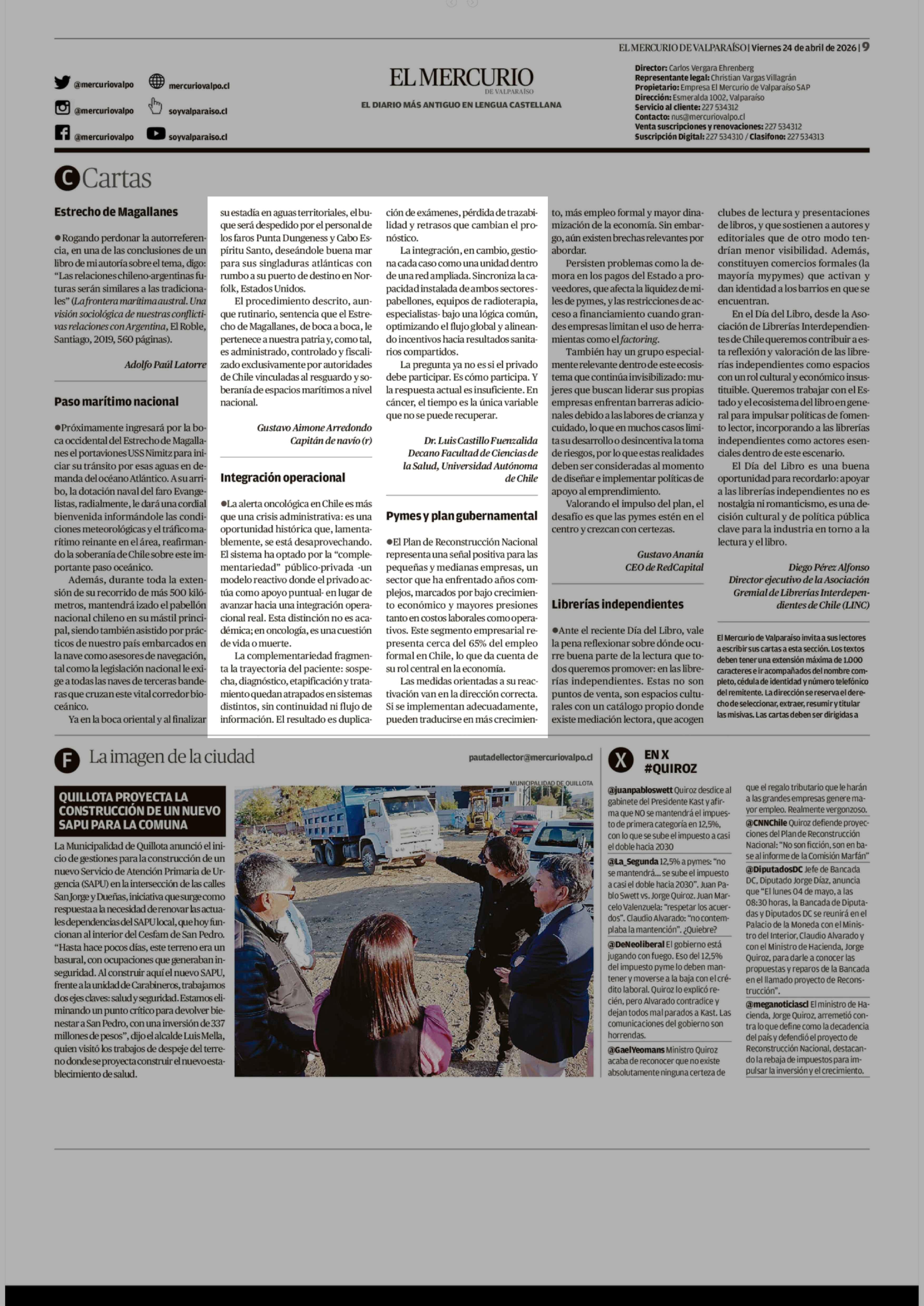 Cartas: Integración operacional 24-04-2026 El Mercurio de Valparaíso |