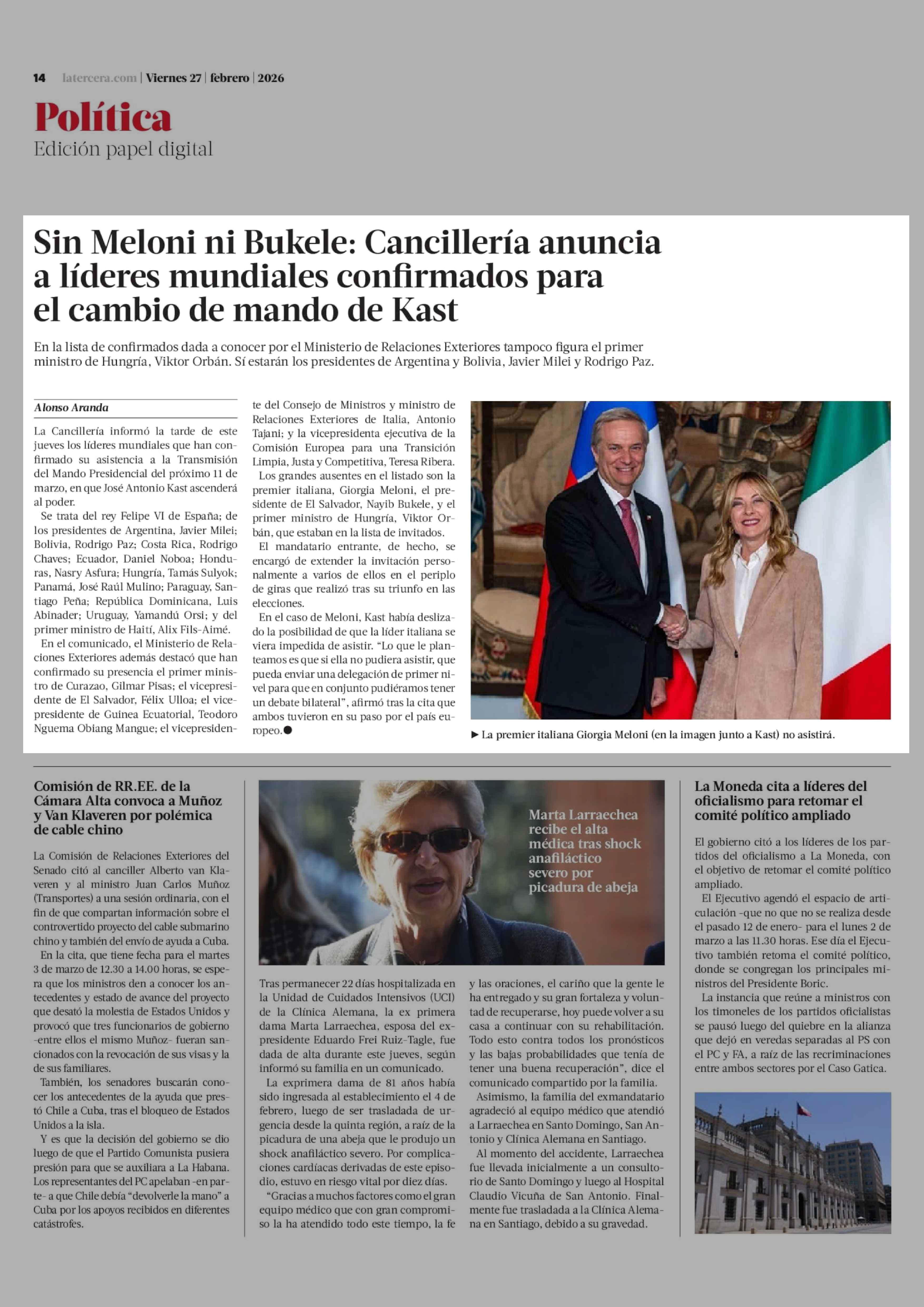 Sin Meloni ni Bukele: Cancillería anuncia a líderes mundiales confirmados para el cambio de mando de Kast 27-02-2026 La Tercera |
