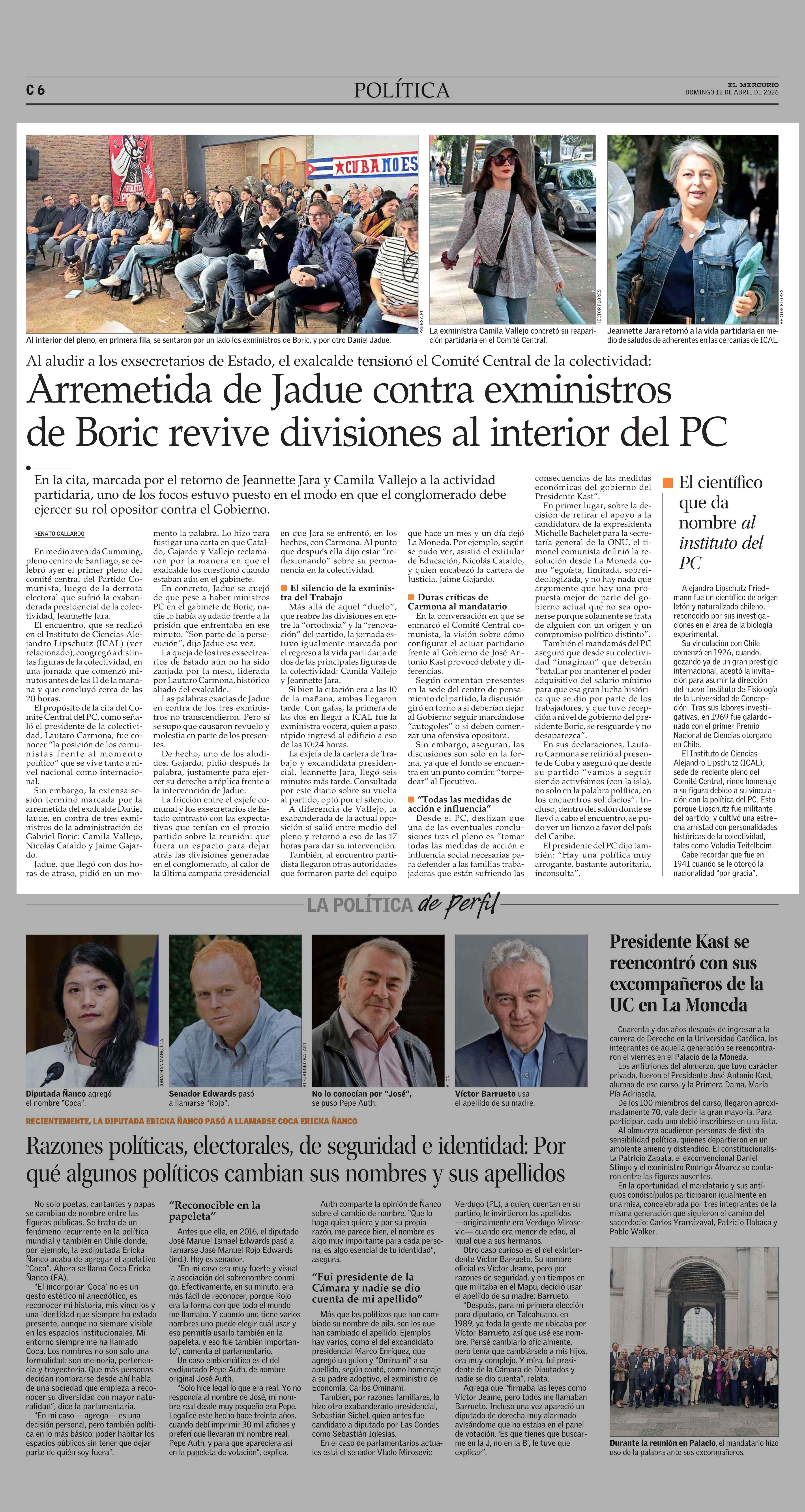 Arremetida de Jadue contra exministros de Boric revive divisiones al interior del PC 12-04-2026 El Mercurio |