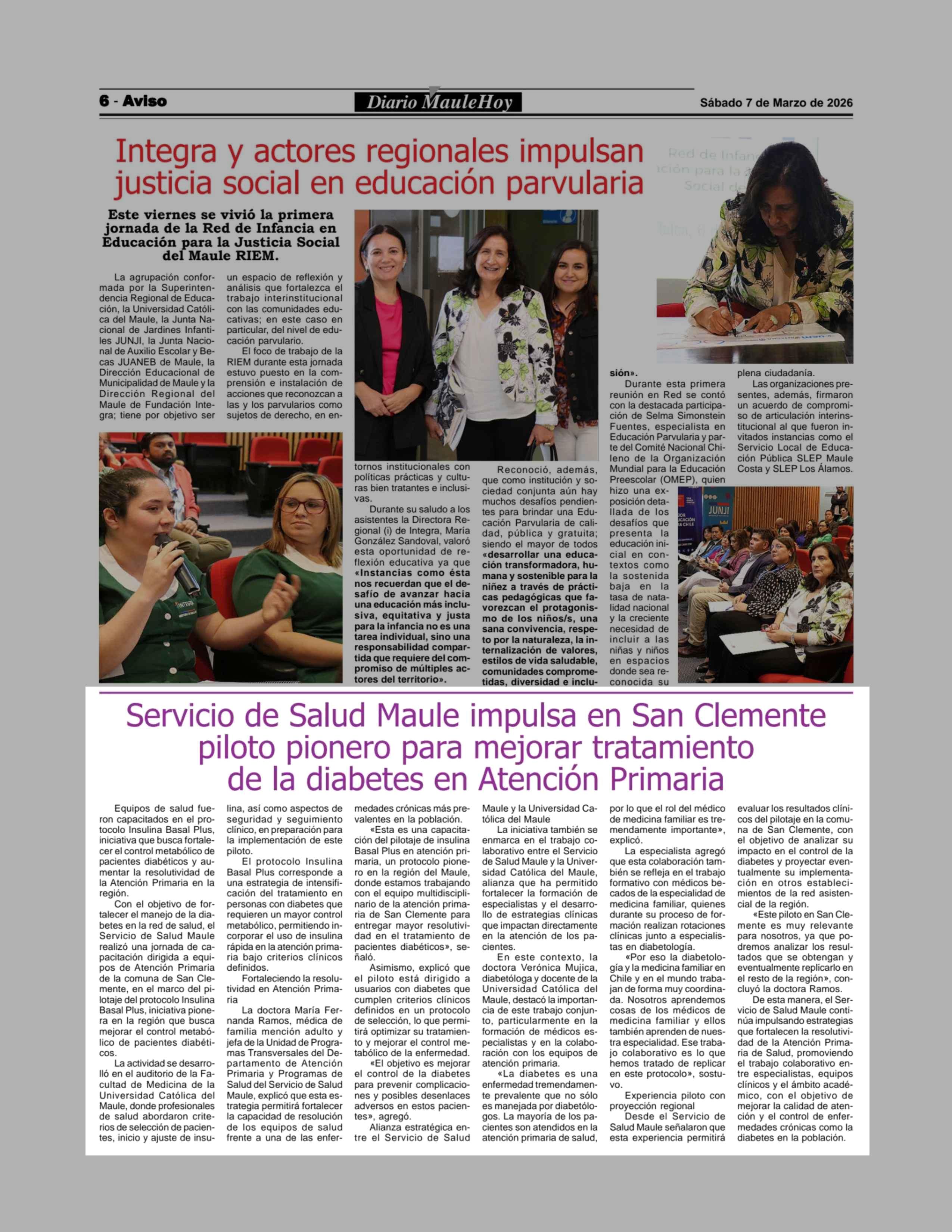 Servicio de Salud Maule impulsa en San Clemente piloto pionero para mejorar tratamiento de la diabetes en Atención Primaria 07-03-2026 Maule Hoy |