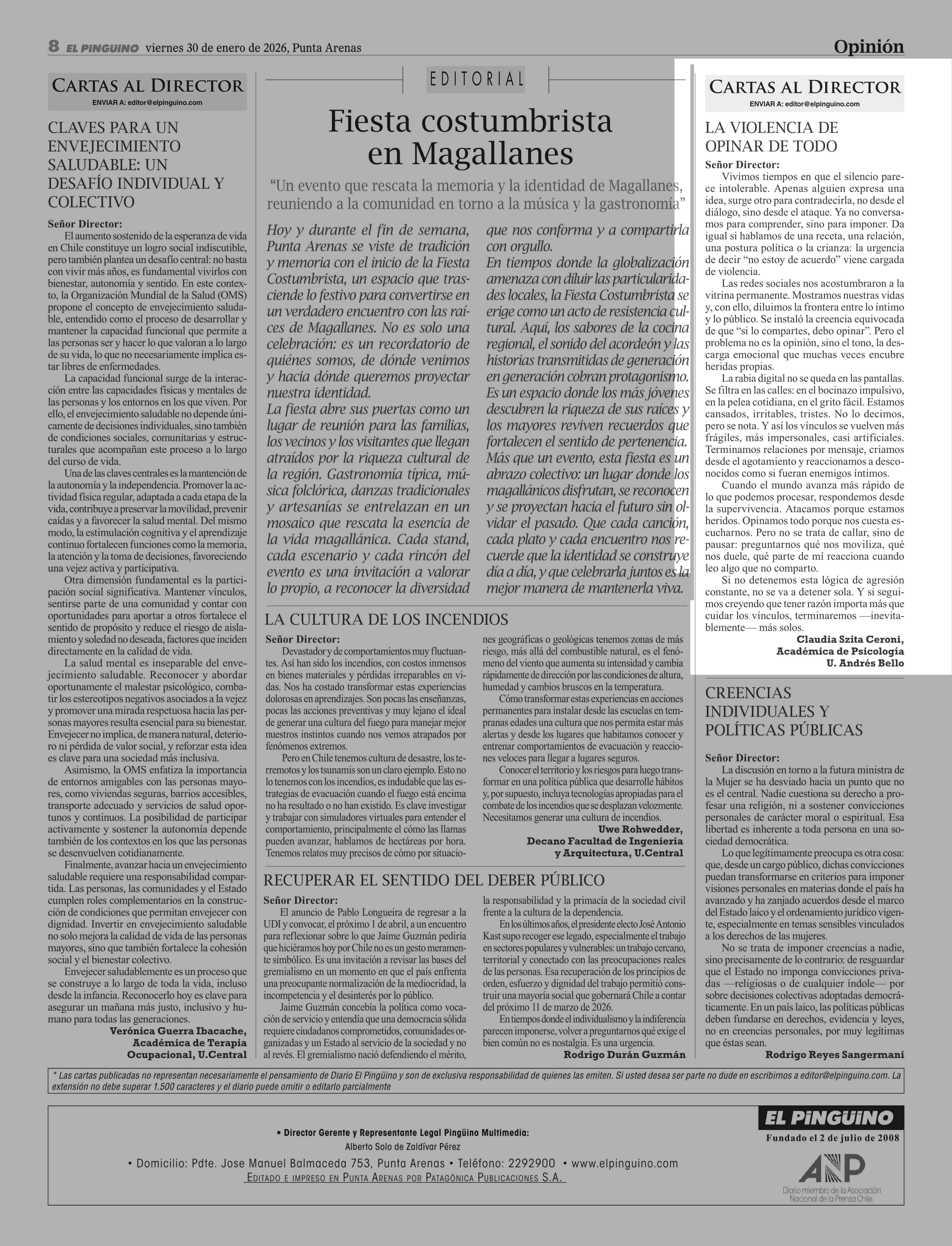 CARTAS: CARTAS AL DIRECTOR VIOLENCIA DE OPINAR DE TODO 31-01-2026 El Pingüino |
