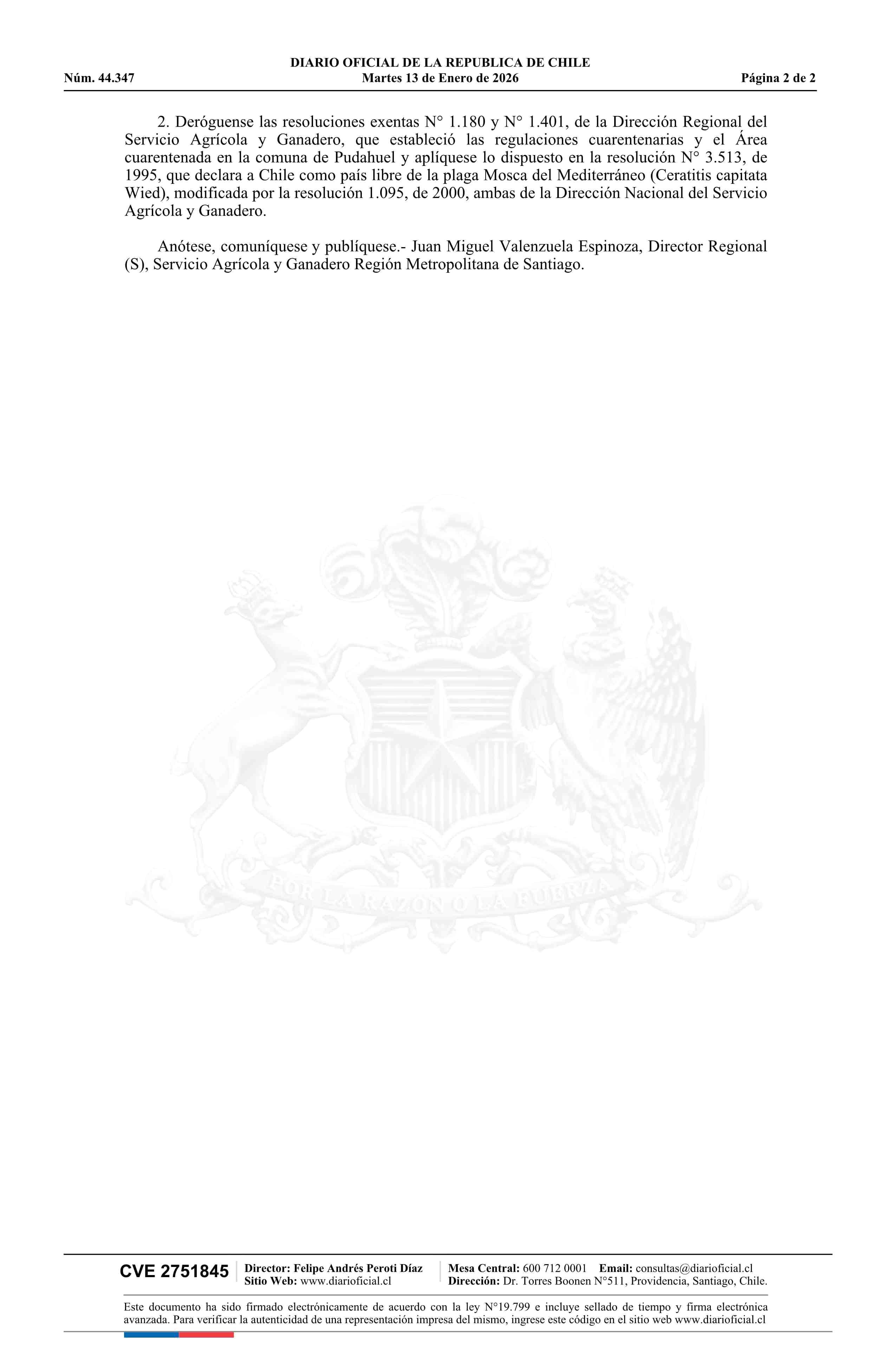 Resolución exenta número 5.112, de 2025.- Declara libre de Mosca del Mediterráneo (Ceratitis capitata W.) el área cuarentenada para el Mercado de China 13-01-2026 DIARIO OFICIAL CHILE - BOLETÍN OFICIAL DE MINERÍA |