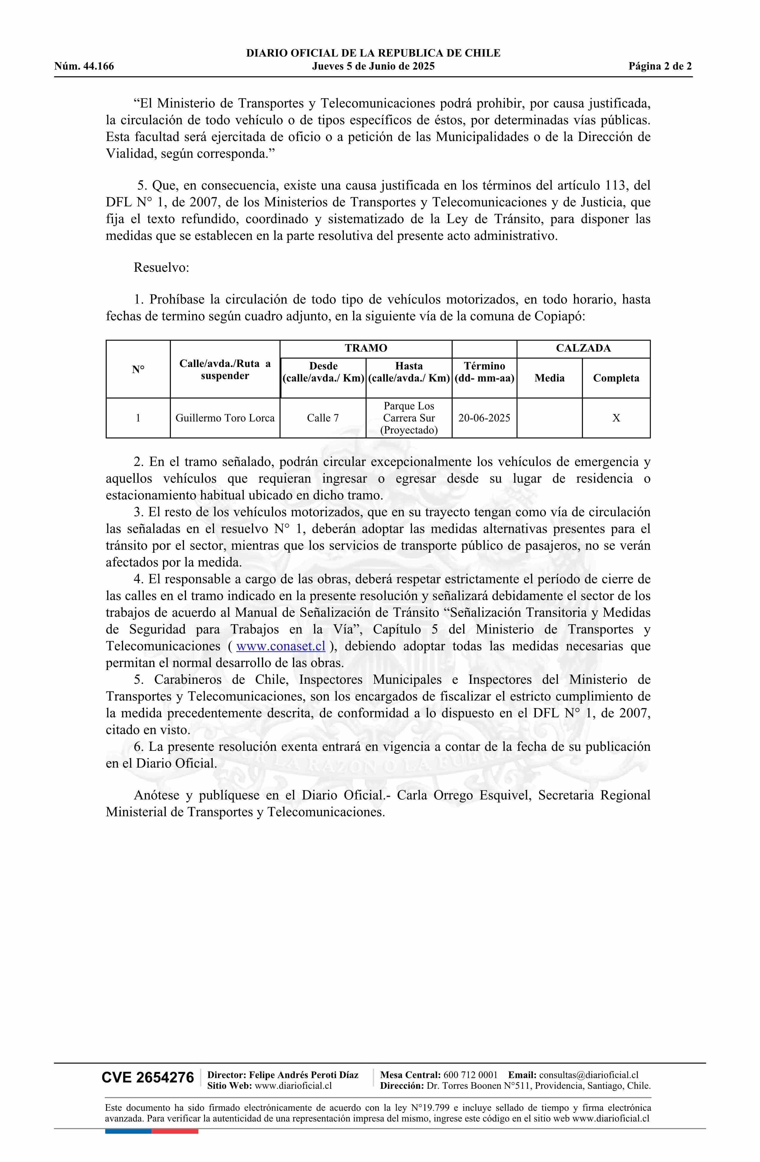Resolución exenta número 204, de 2025.- Prohíbe circulación de vehículos motorizados en tramo de vía que indica, de la comuna de Copiapó 05-06-2025 Diario Oficial Edición Electrónica |