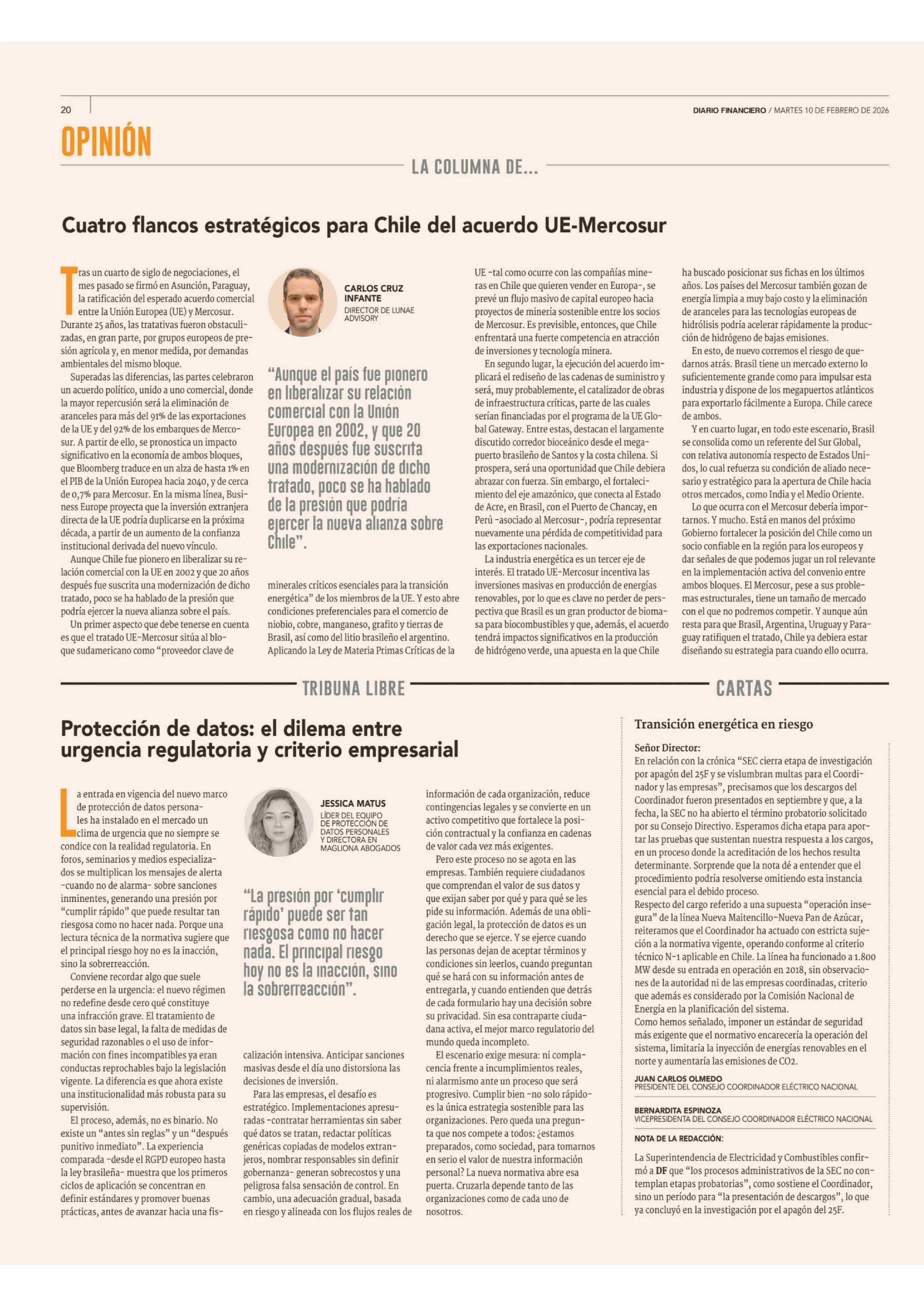 Columnas de Opinión: Cuatro flancos estratégicos para Chile del acuerdo UE-Mercosur 10-02-2026 Diario Financiero |