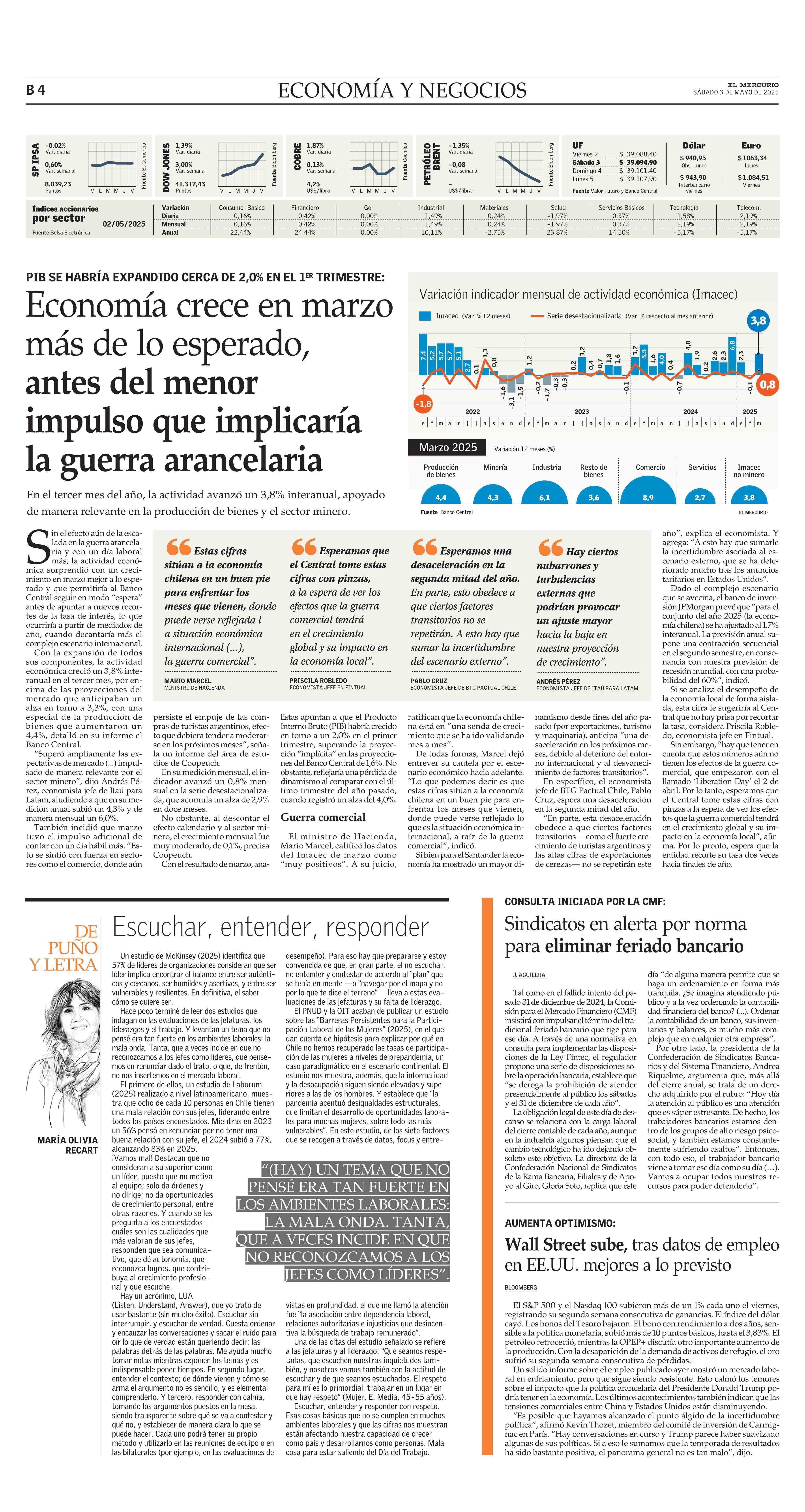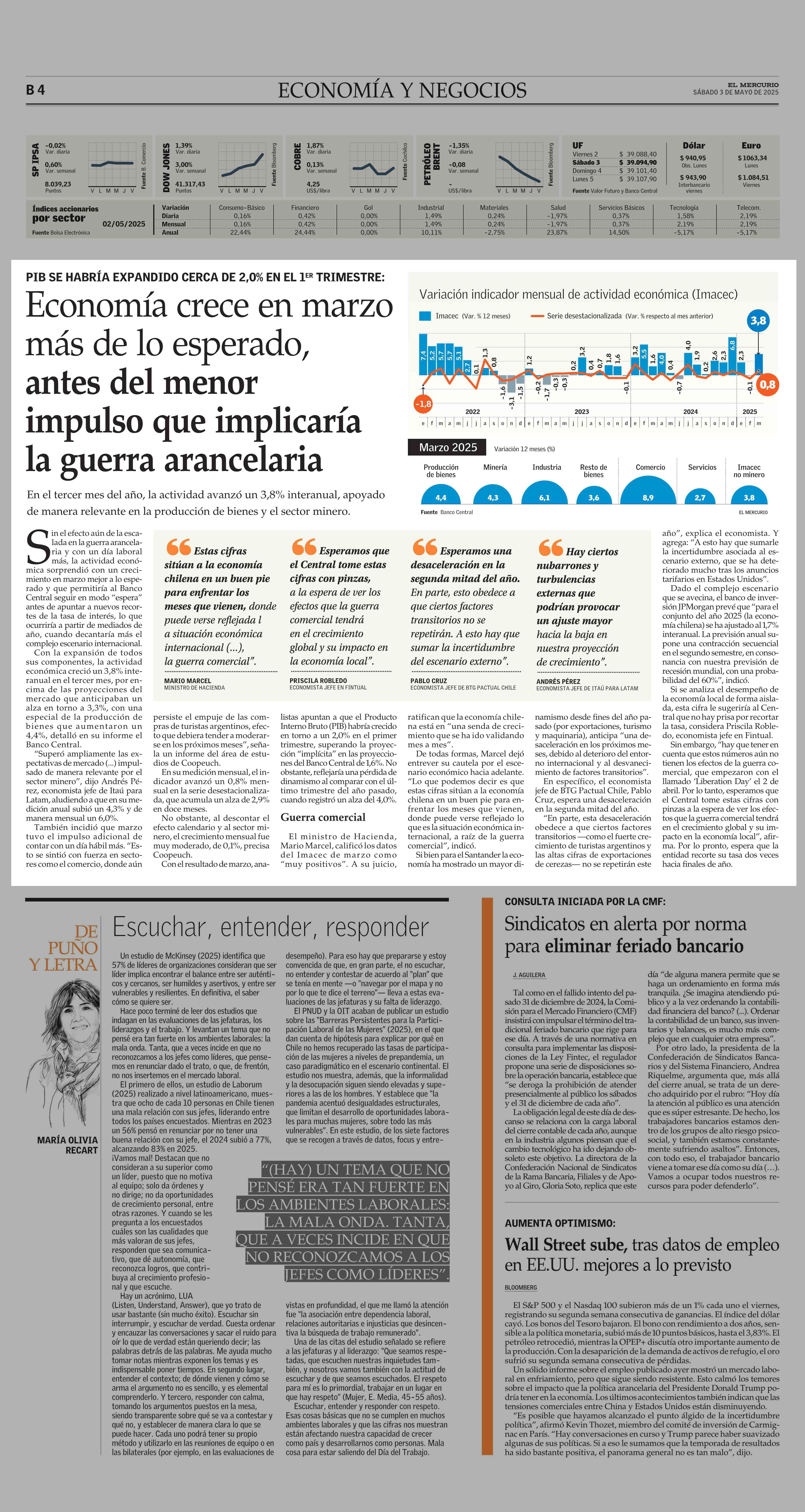 Economía crece en marzo más de lo esperado, antes del menor impulso que implicaría la guerra arancelaria 03-05-2025 El Mercurio |