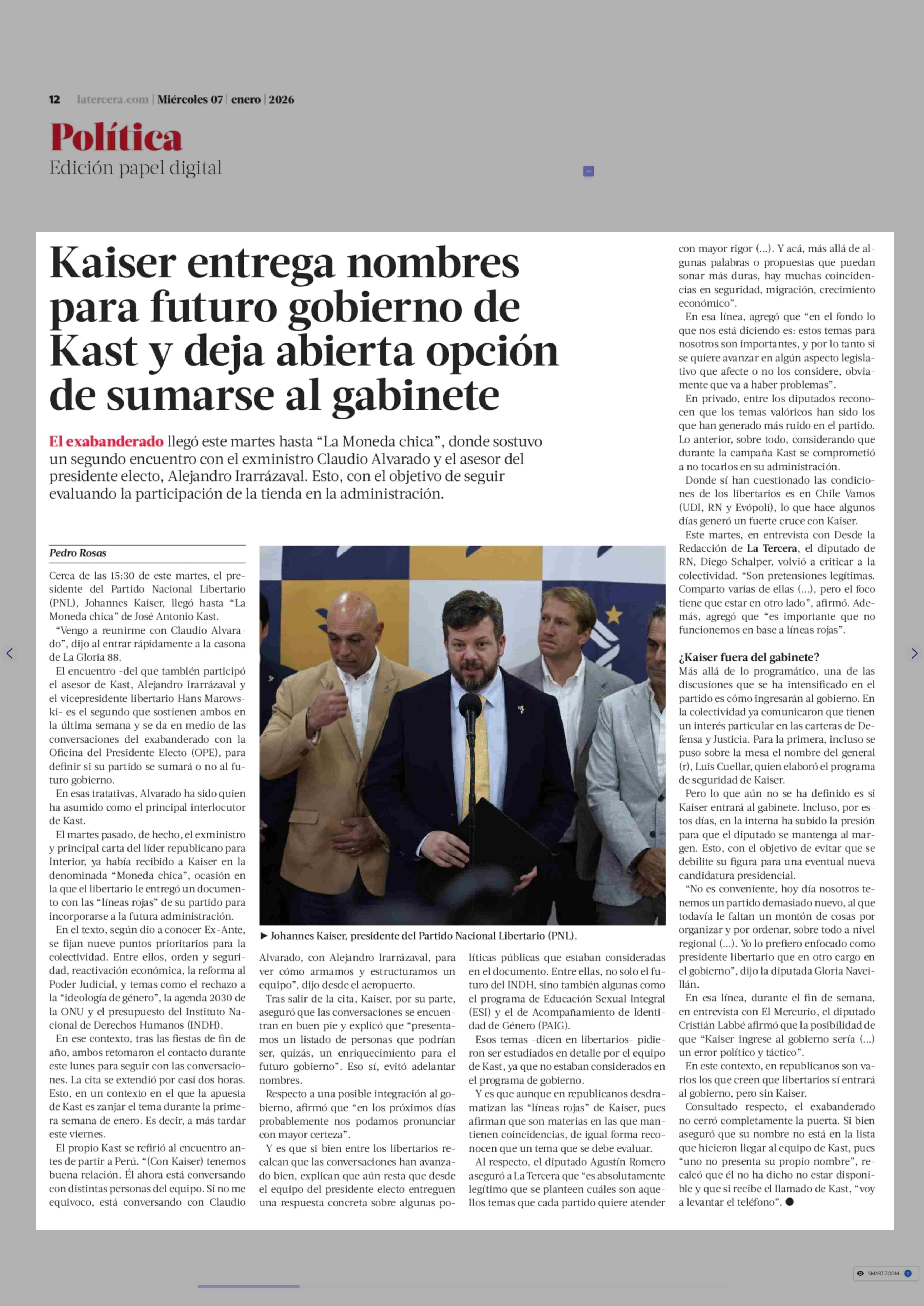 Kaiser entrega nombres para futuro gobierno de Kast y deja abierta opción de sumarse al gabinete 07-01-2026 La Tercera |