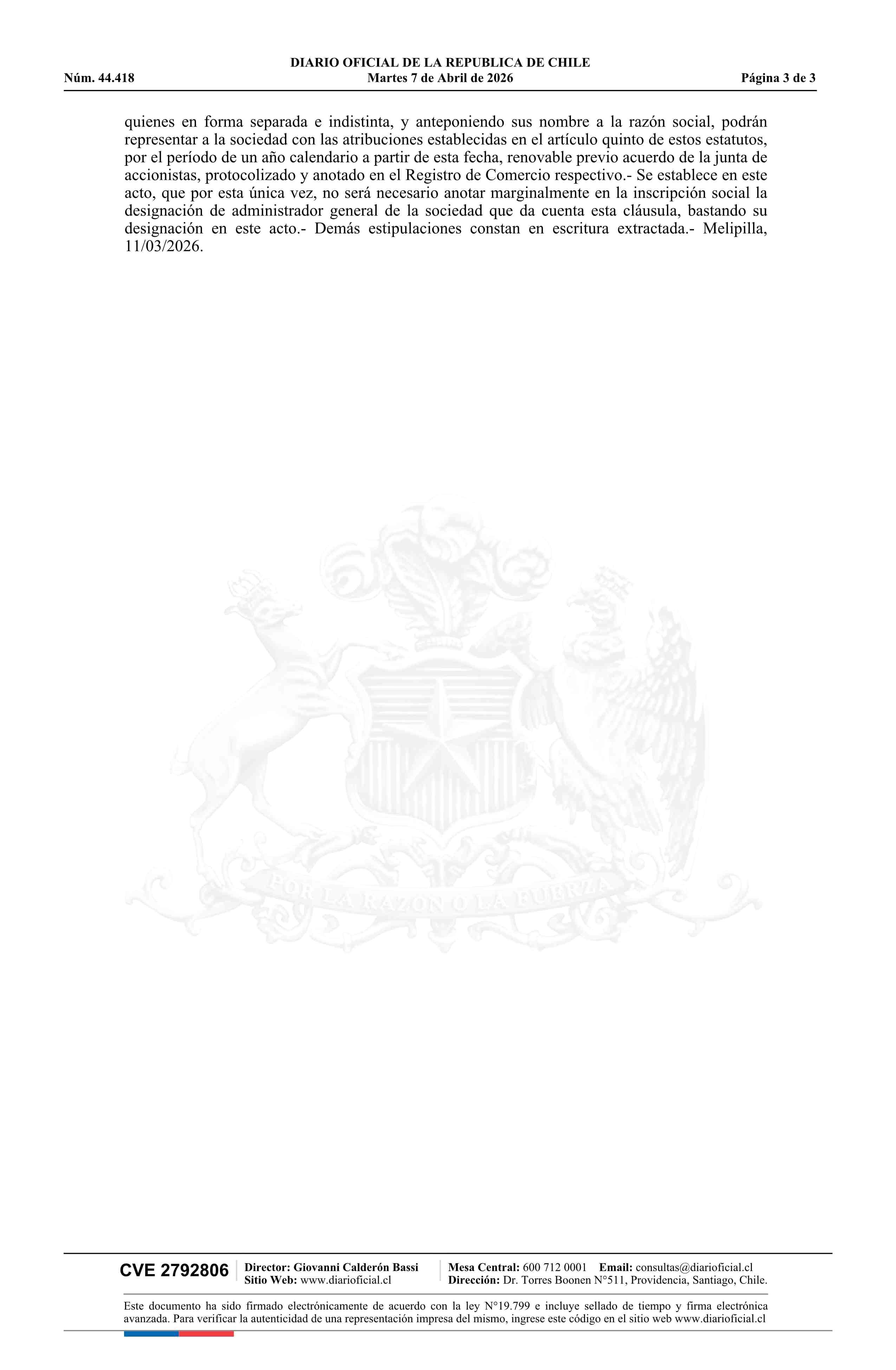 SERVICIOS FUNERARIOS LAS ROSAS SpA 07-04-2026 Diario Oficial Edición Electrónica |