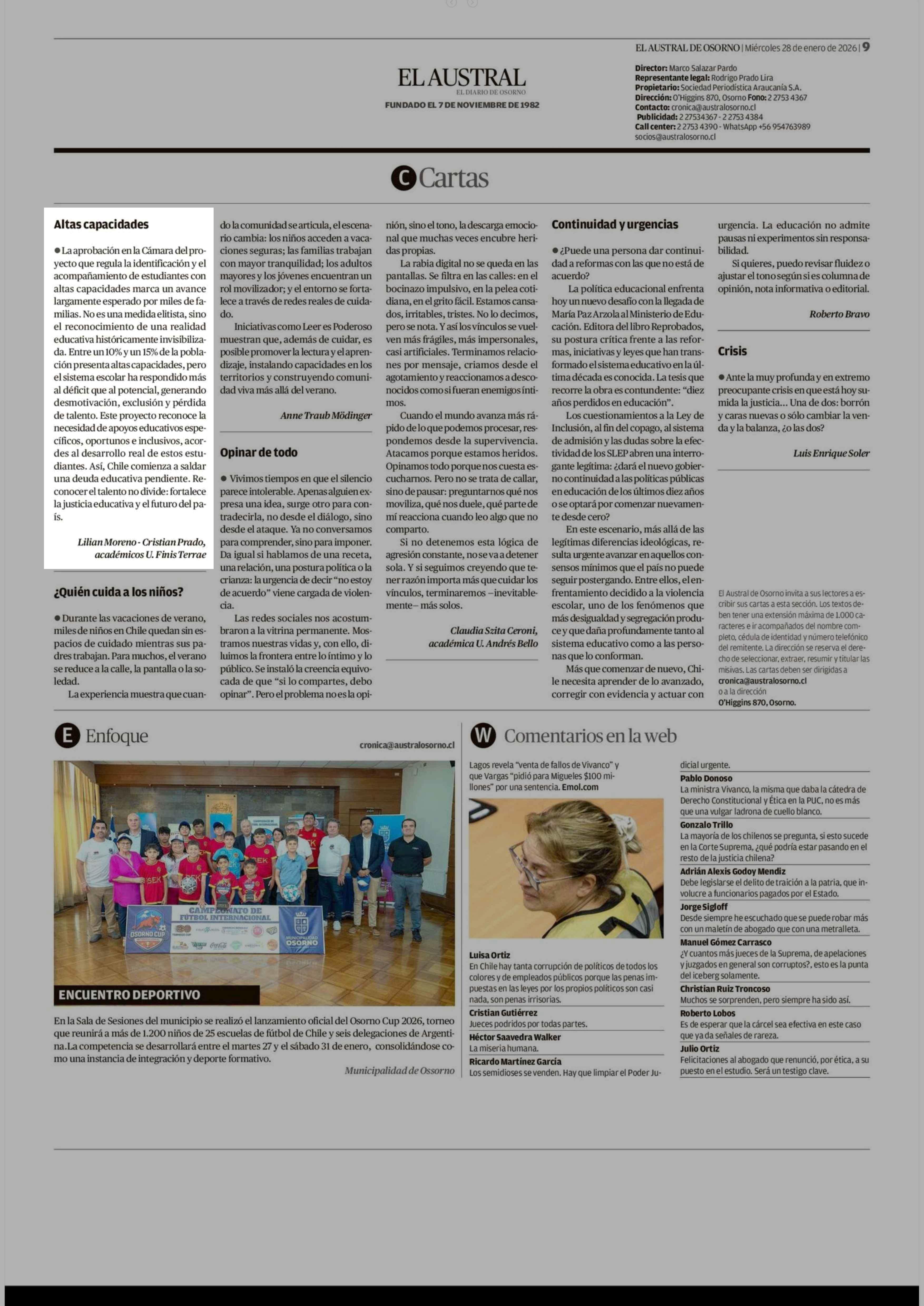 Cartas: Altas capacidades 28-01-2026 El Austral de Osorno |