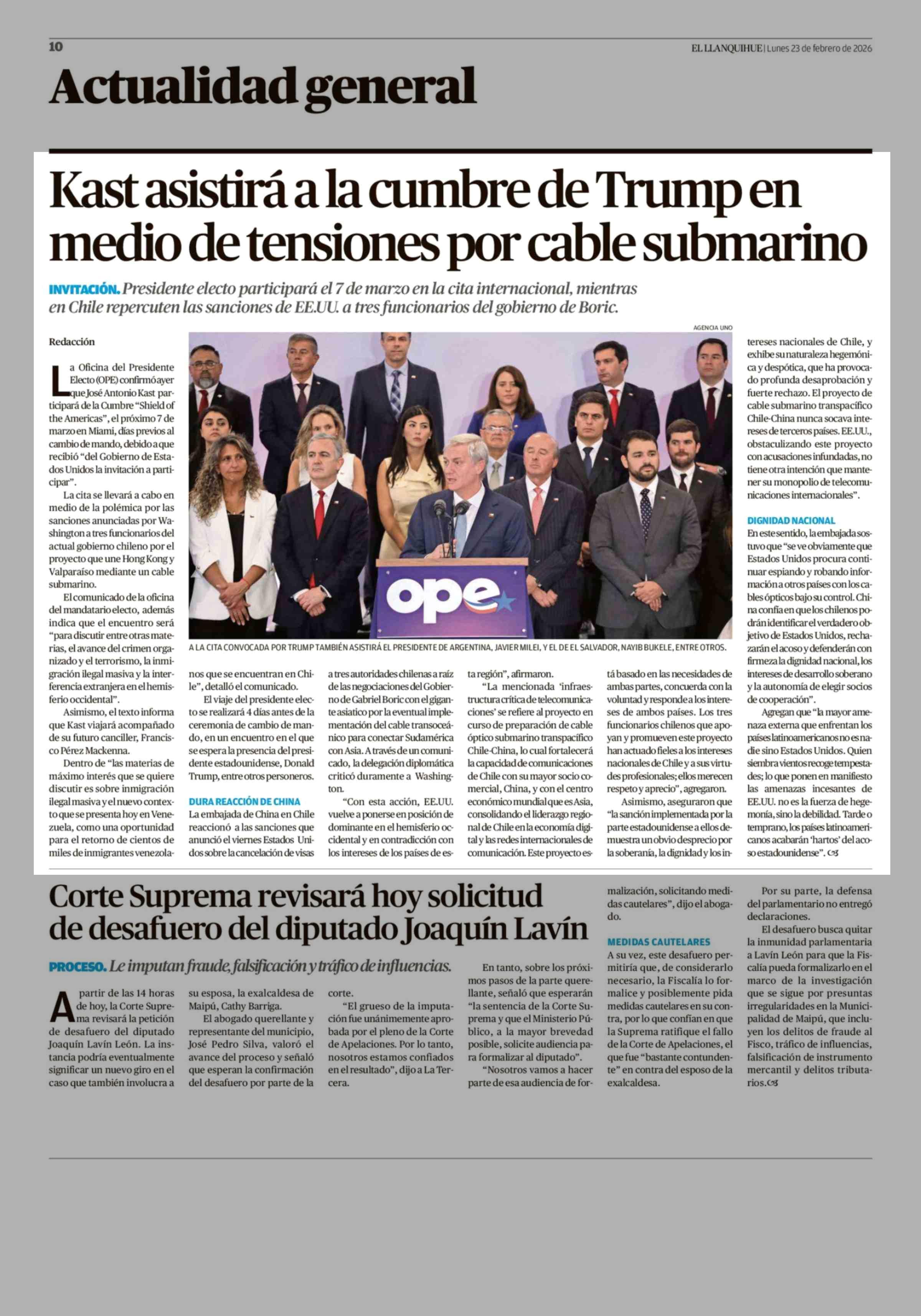 Kast asistirá a la cumbre de Trump en medio de tensiones por cable submarino 23-02-2026 El Llanquihue |