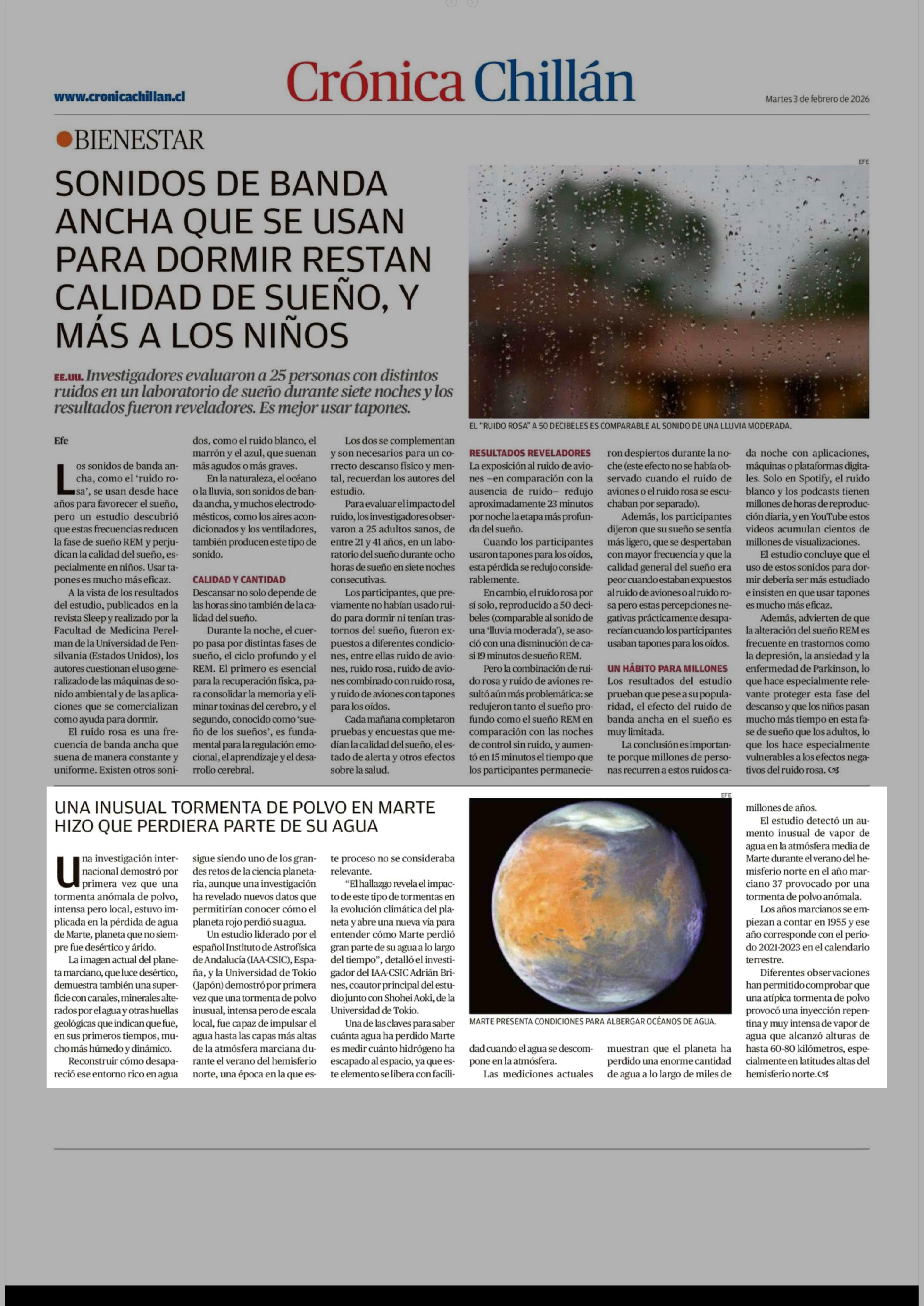 UNA INUSUAL TORMENTA DE POLVO EN MARTE HIZO QUE PERDIERA PARTE DE SU AGUA 03-02-2026 Crónica de Chillán |