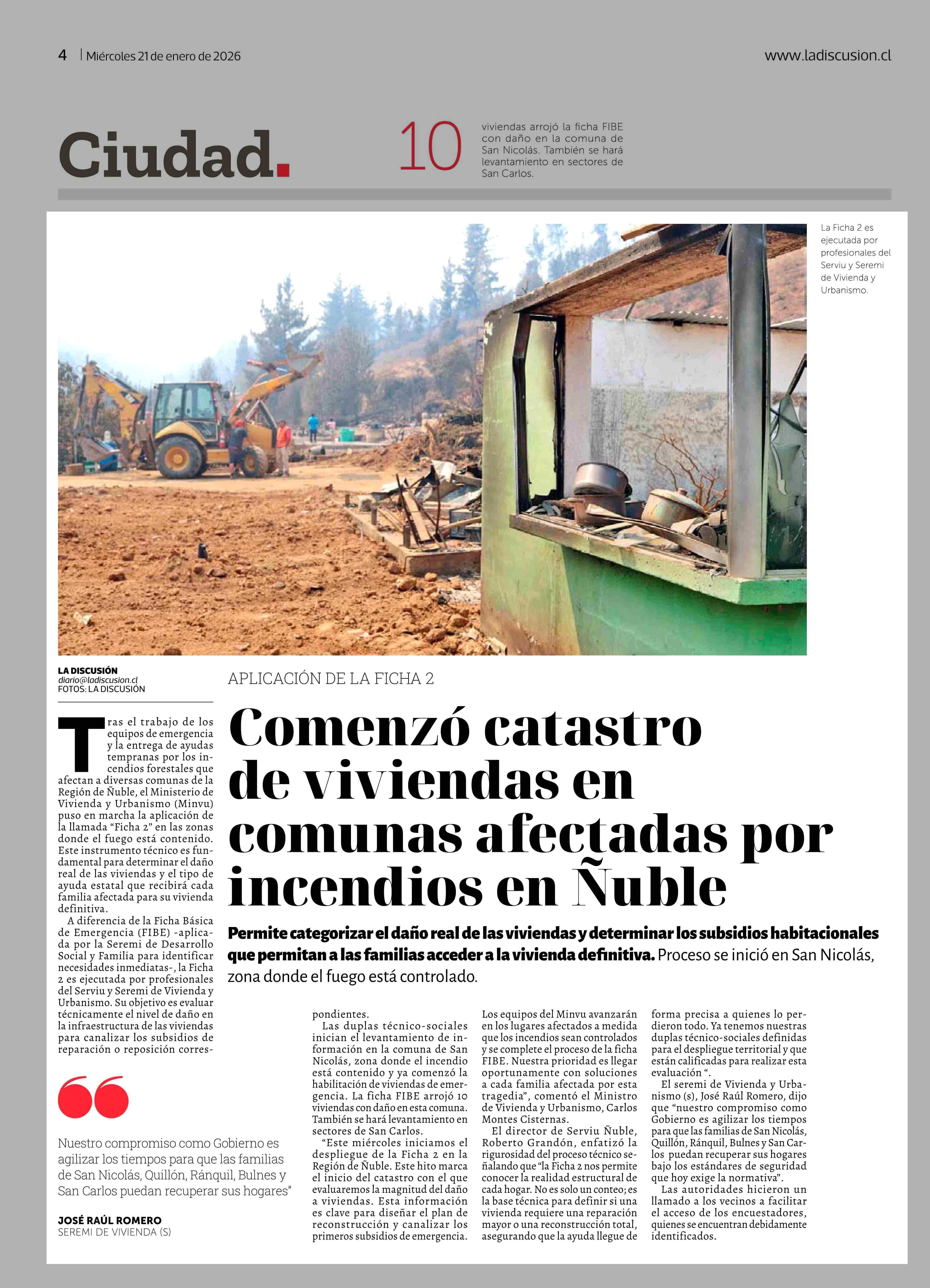 Comenzó catastro de viviendas en comunas afectadas por incendios en Nuble 21-01-2026 La Discusión |