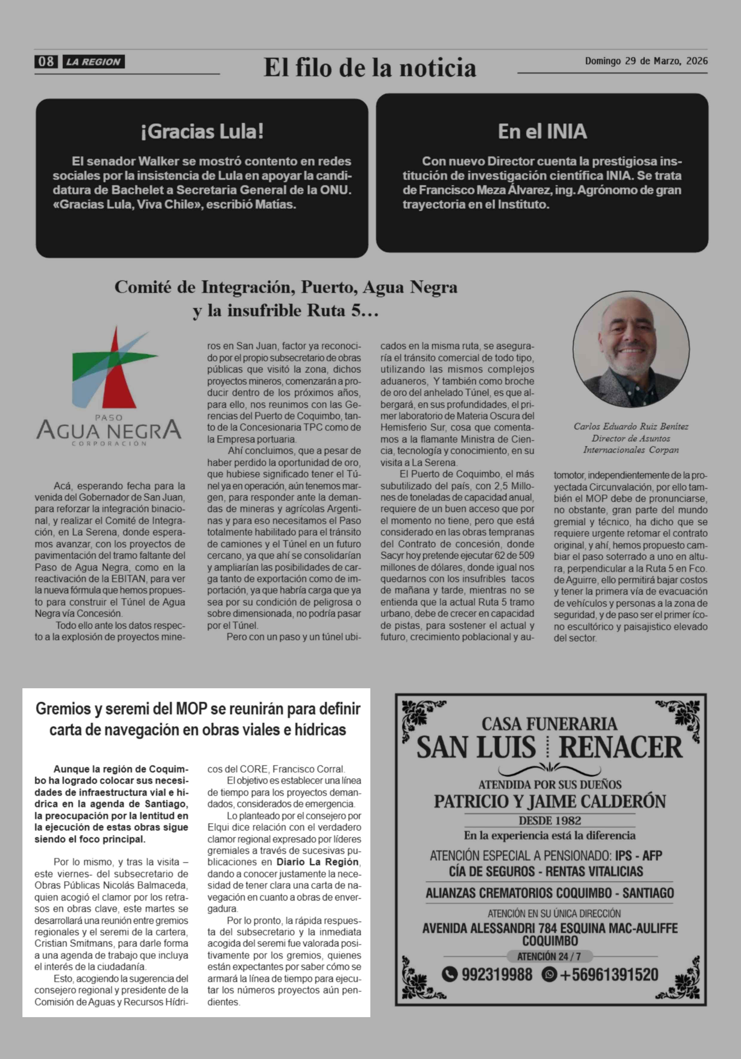 Gremios y seremi del MOP se reunirán para definir carta de navegación en obras viales e hídricas 29-03-2026 Diario la Región |