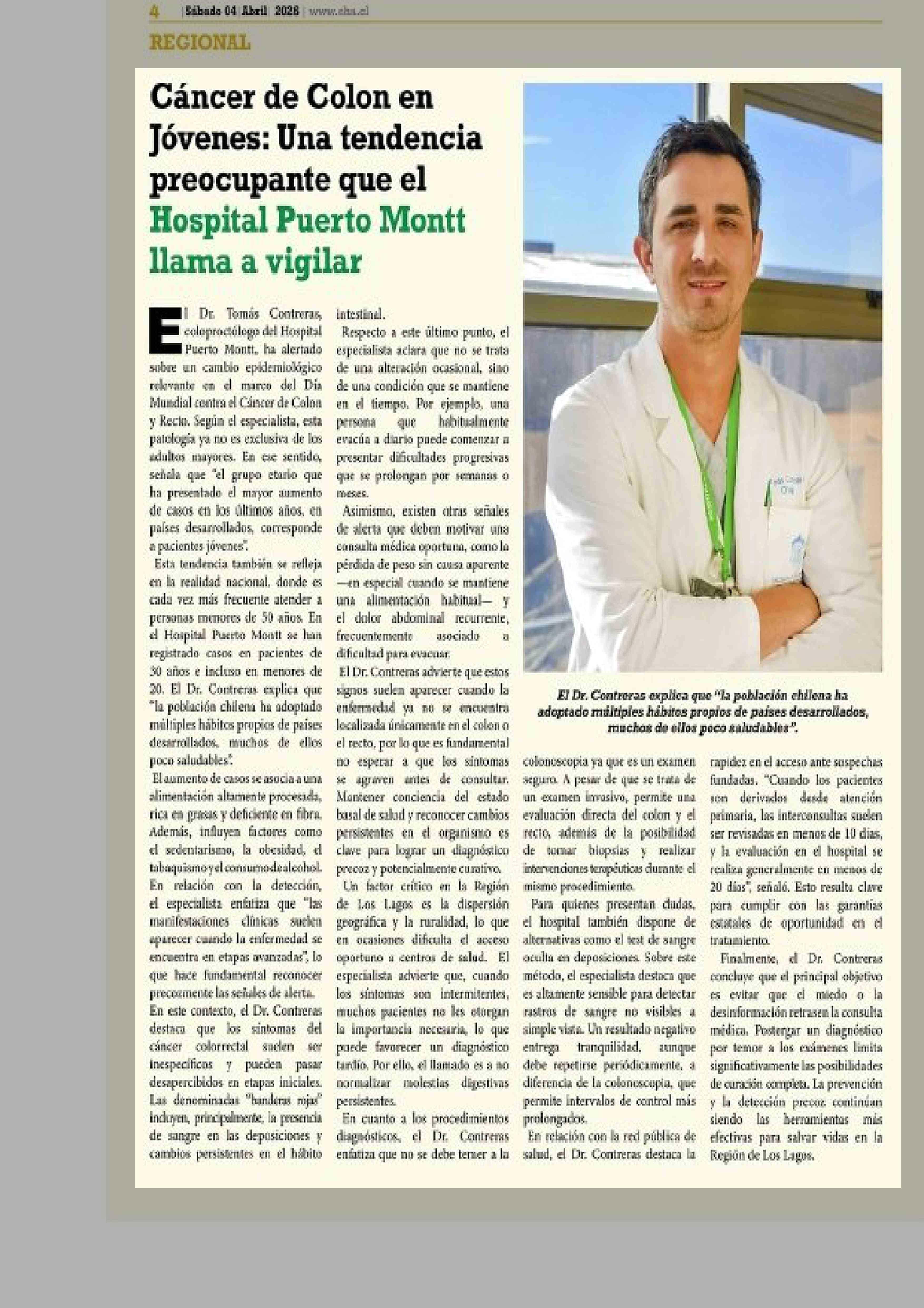 Cáncer de Colon en Jóvenes: Una tendencia preocupante que el Hospital Puerto Montt llama a vigilar 04-04-2026 El Heraldo Austral |