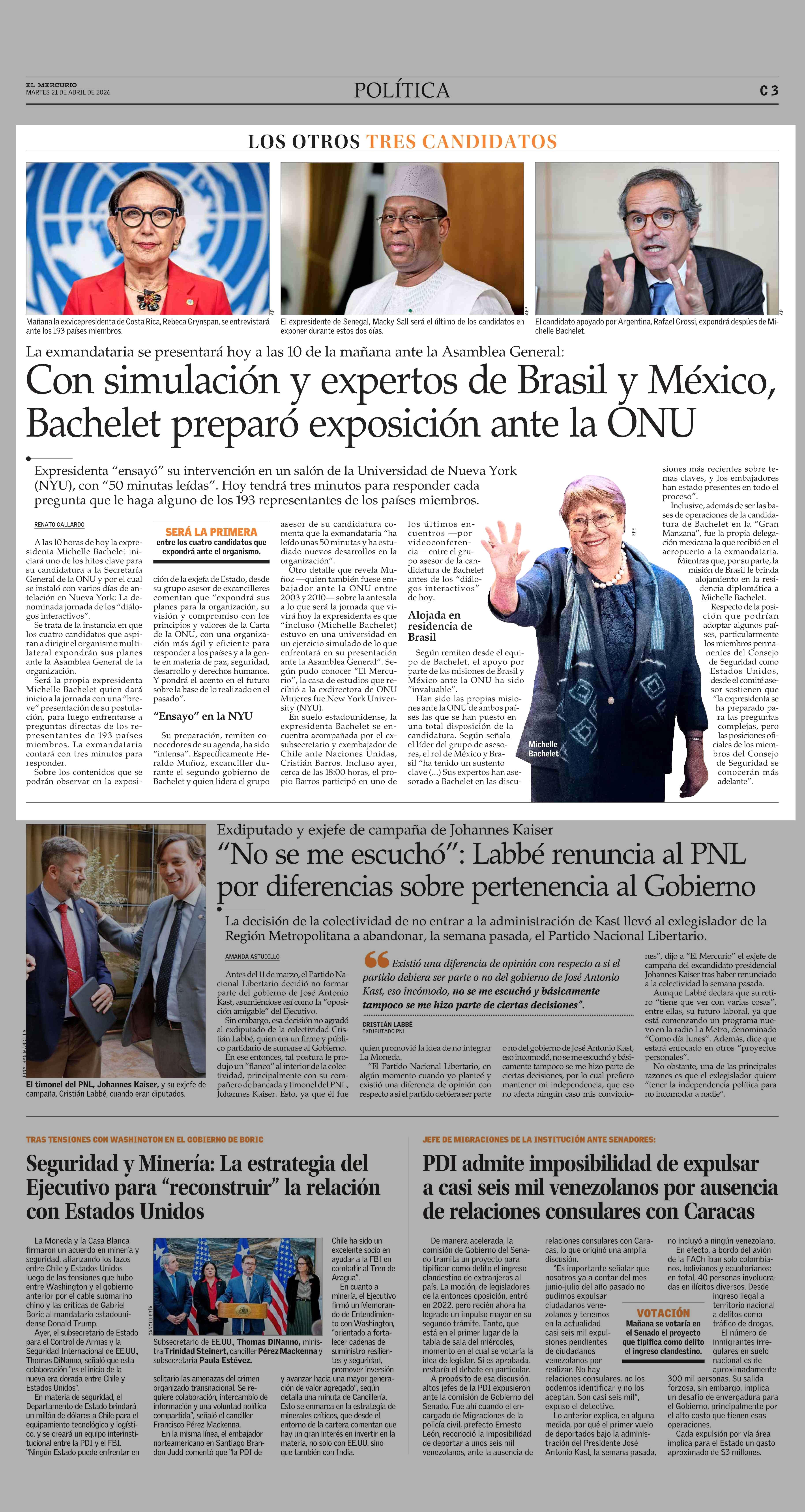 Con simulación y expertos de Brasil y México, Bachelet preparó exposición ante la ONU 21-04-2026 El Mercurio |