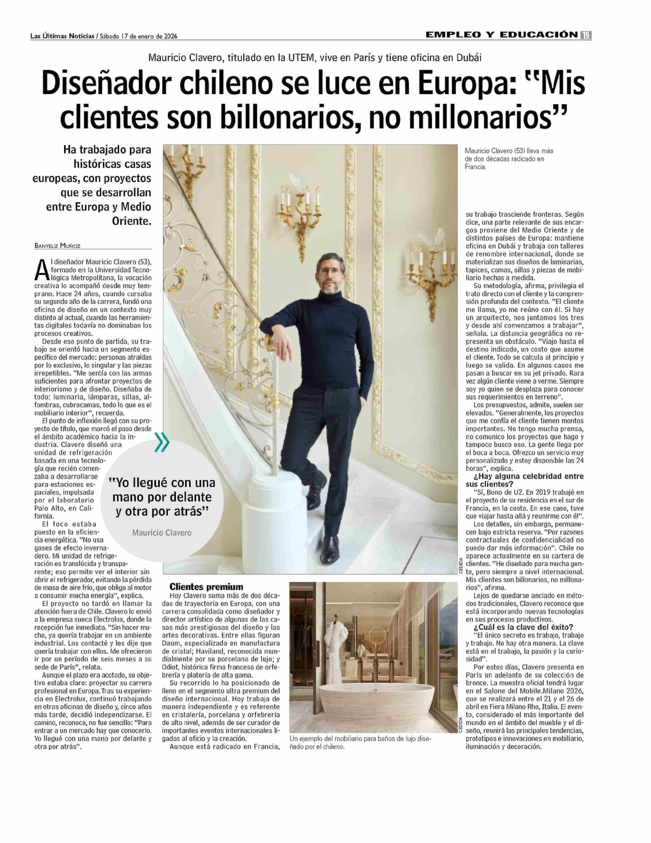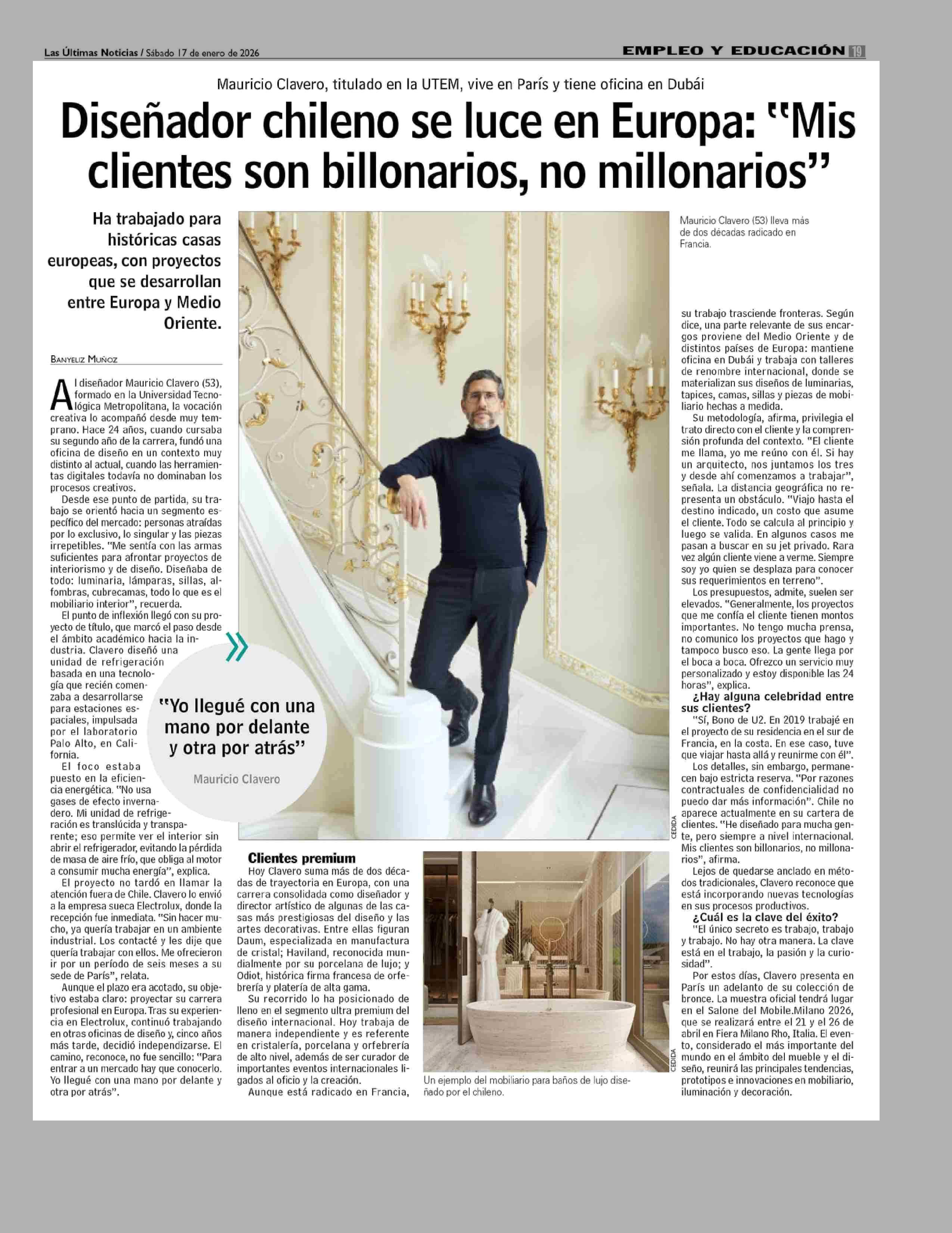 Diseñador chileno se luce en Europa: "Mis clientes son billonarios, no millonarios" 17-01-2026 Las Últimas Noticias |
