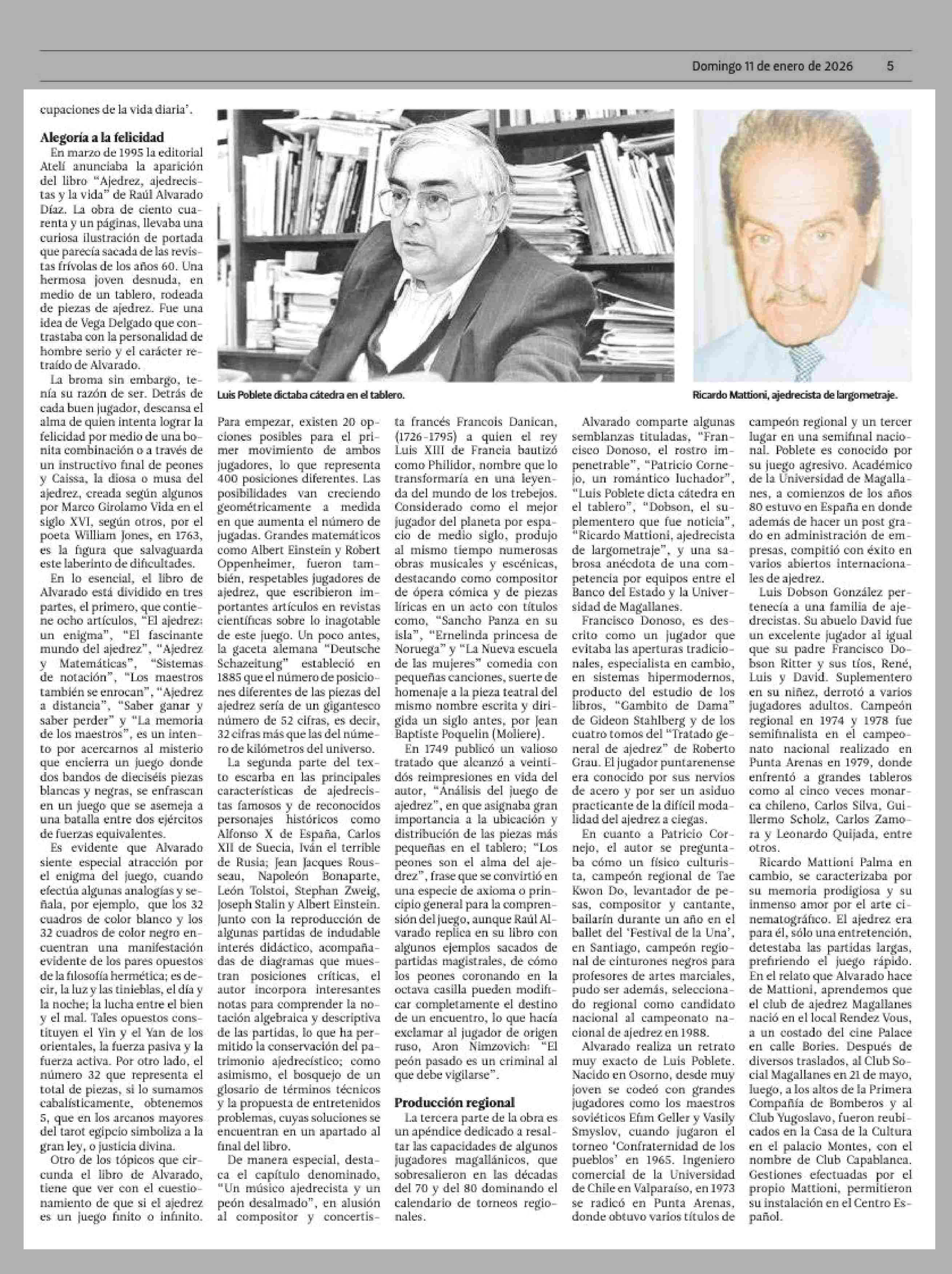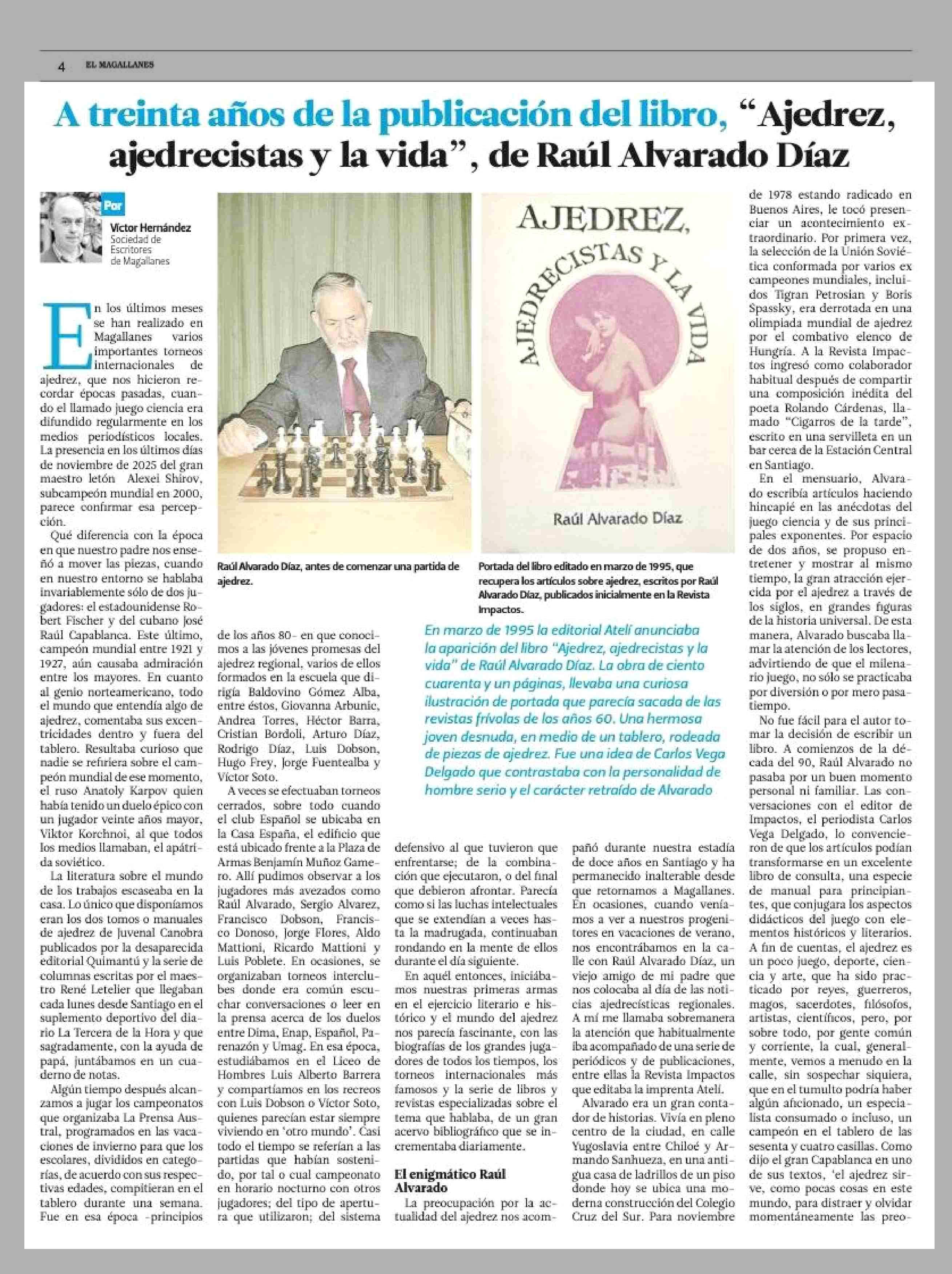A treinta años de la publicación del libro, "Ajedrez, ajedrecistas y la vida", de Raúl Alvarado Díaz 11-01-2026 El Magallanes |