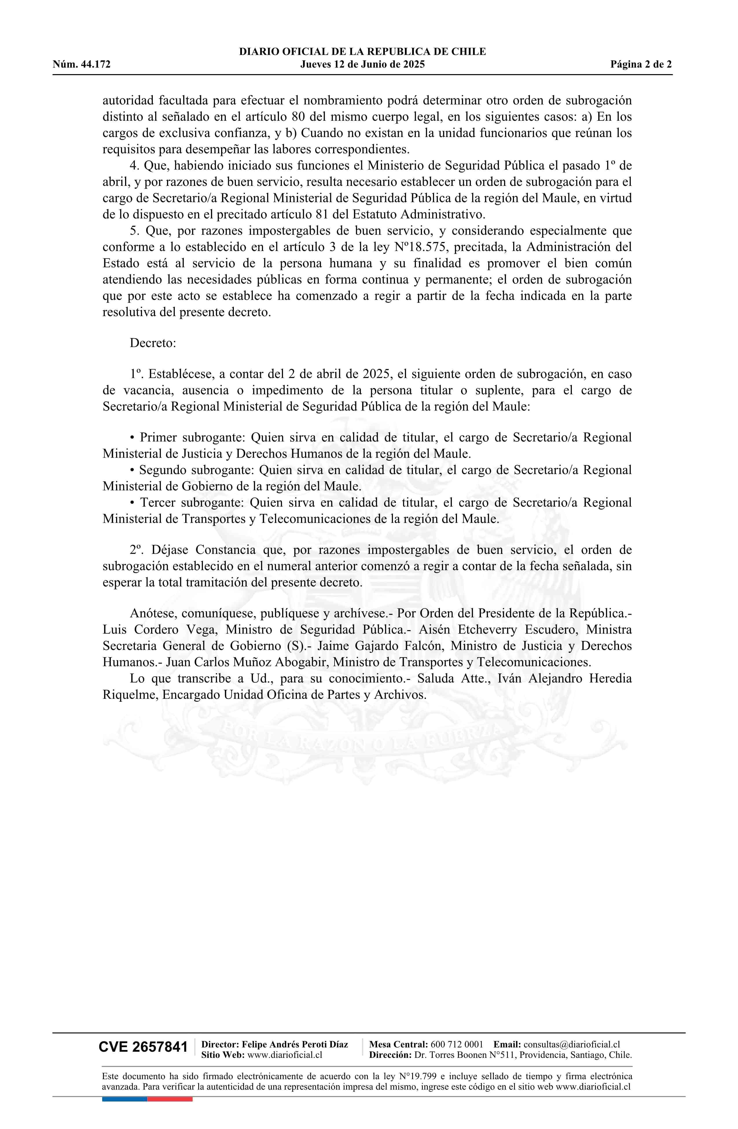 Decreto exento número 66, de 2025.- Establece orden de subrogación para el cargo de Secretario/a Regional Ministerial de Seguridad Pública de la Región del Maule 12-06-2025 DIARIO OFICIAL CHILE - BOLETÍN OFICIAL DE MINERÍA |
