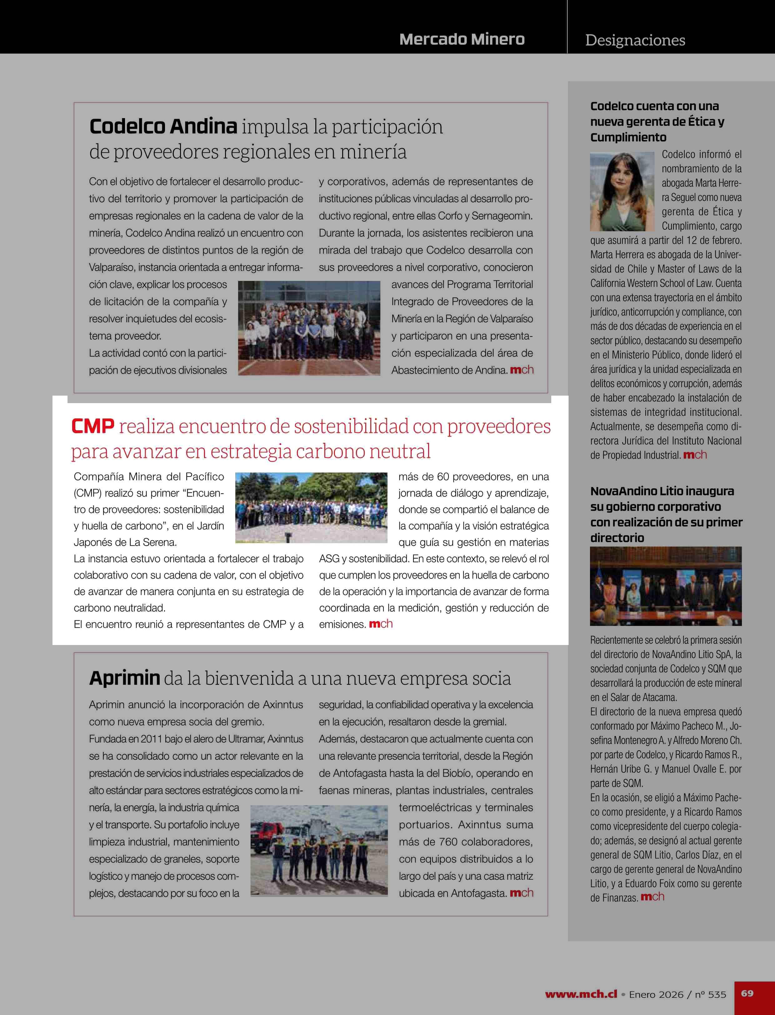 CMP realiza encuentro de sostenibilidad con proveedores para avanzar en estrategia carbono neutral - 23-01-2026 Revista Minería Chilena |