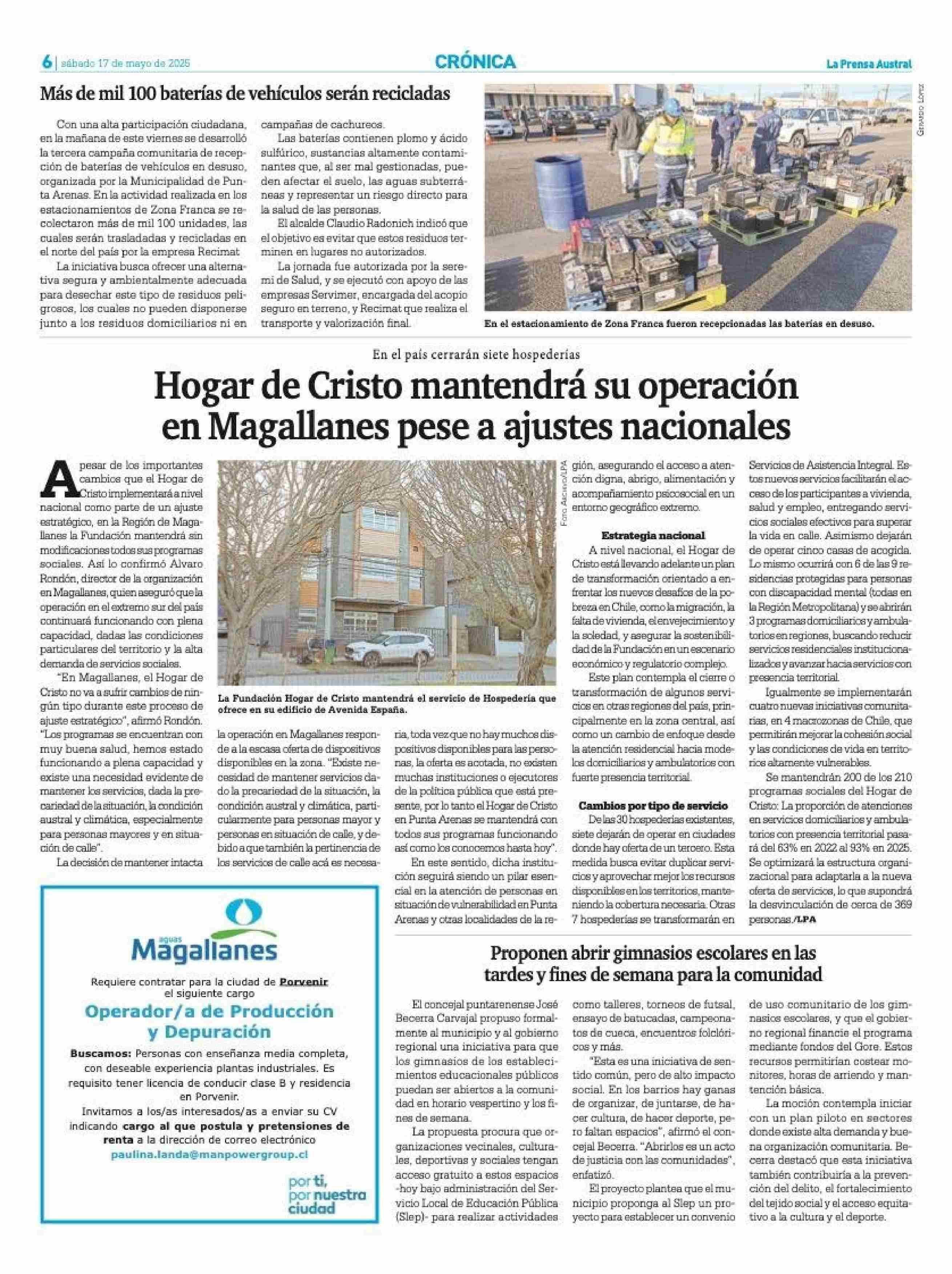 Hogar de Cristo mantendrá su operación en Magallanes pese a ajustes nacionales 17-05-2025 La Prensa Austral |