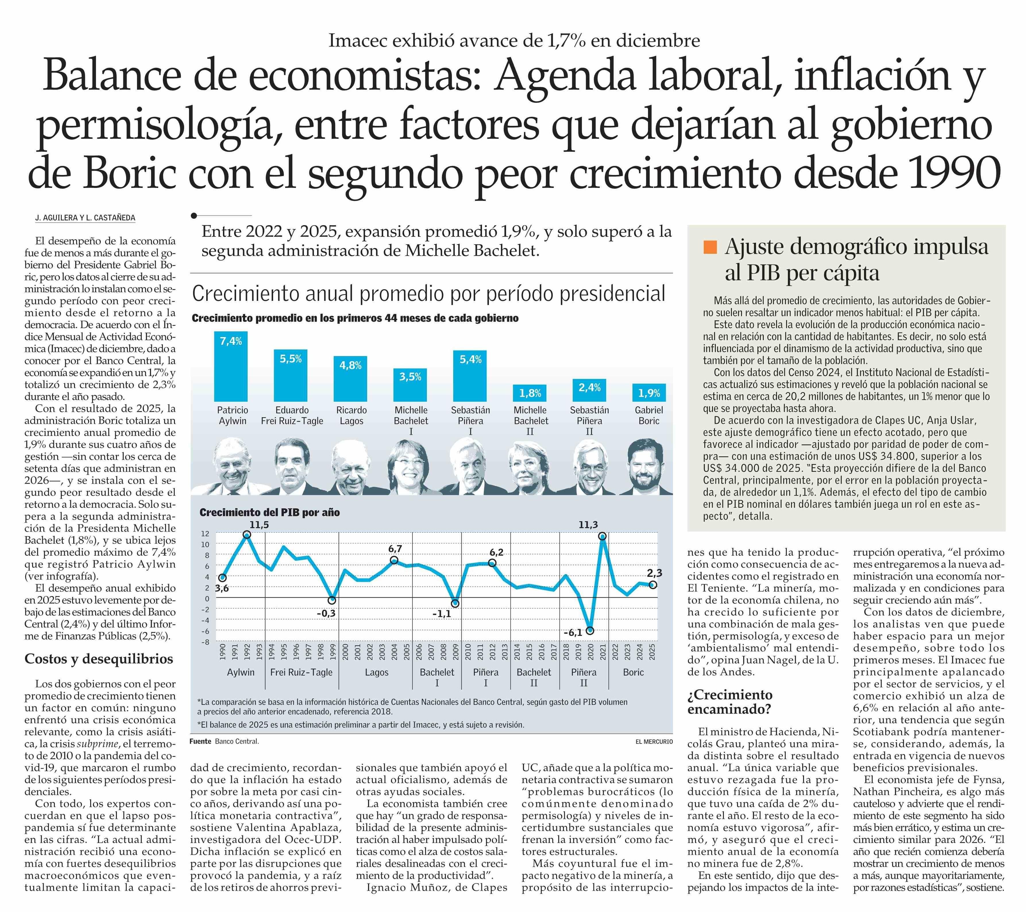 Balance de economistas: Agenda laboral, inflación y permisología, entre factores que dejarían al gobierno de Boric con el segundo peor crecimiento desde 1990 03-02-2026 El Mercurio |