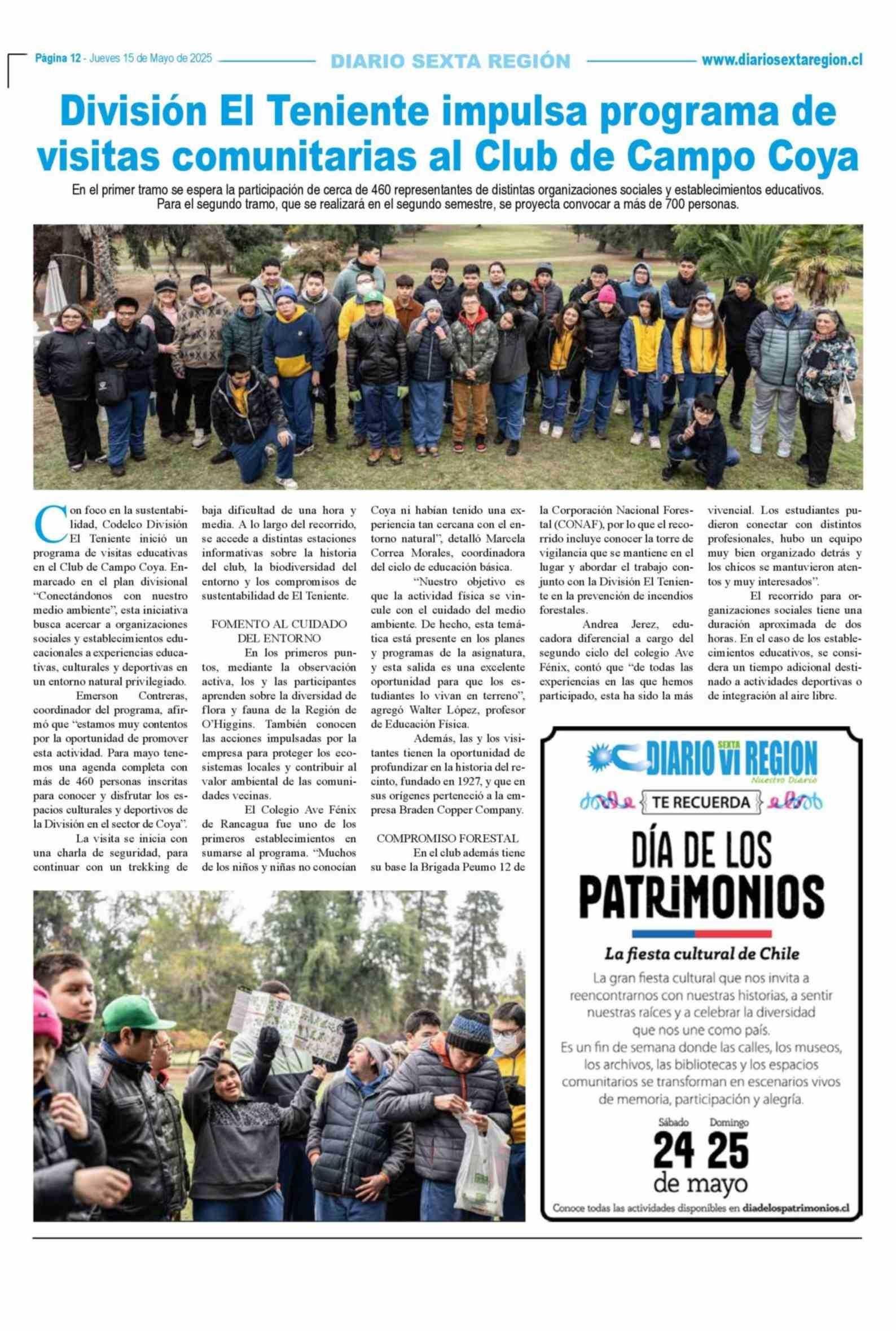 División El Teniente impulsa programa de visitas comunitarias al Club de Campo Coya 15-05-2025 Diario VI Región |